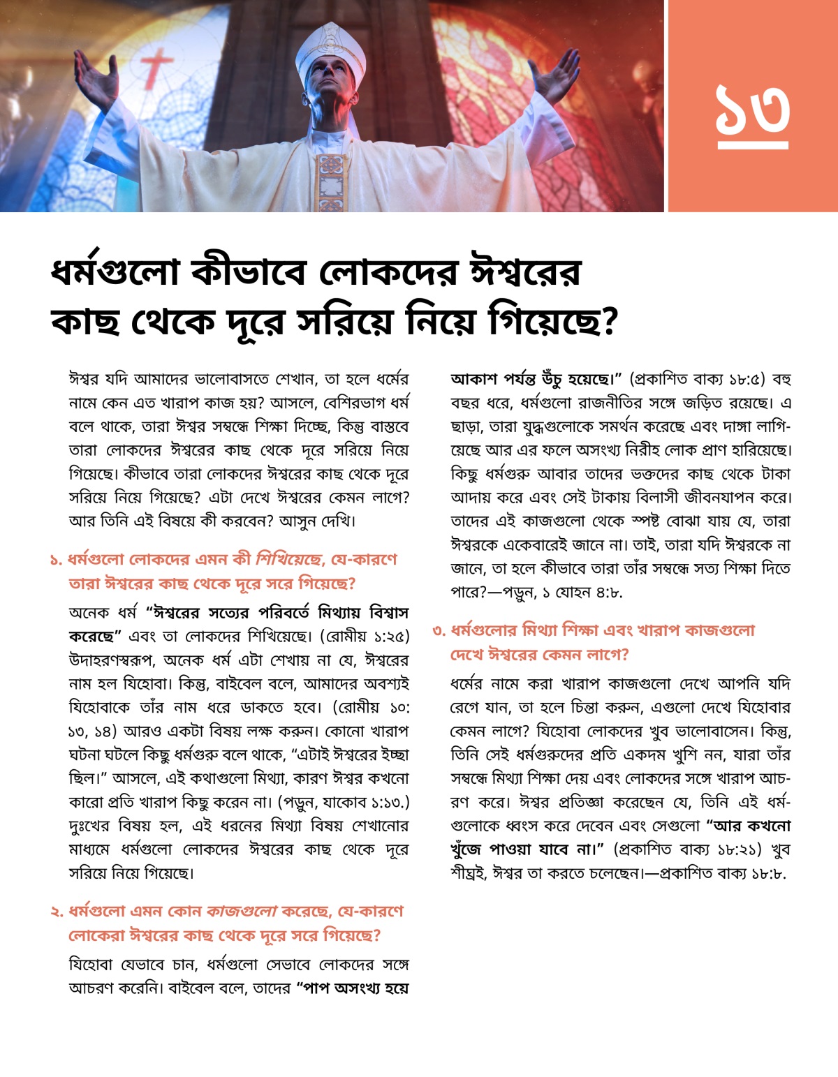 ঈশ্বর যদি আমাদের ভালোবাসতে শেখান, তা হলে ধর্মের নামে কেন এত খারাপ কাজ হয়? আসলে, বেশিরভাগ ধর্ম বলে থাকে, তারা ঈশ্বর সম্বন্ধে শিক্ষা দিচ্ছে, কিন্তু বাস্তবে তারা লোকদের ঈশ্বরের কাছ থেকে দূরে সরিয়ে নিয়ে গিয়েছে। কীভাবে তারা লোকদের ঈশ্বরের কাছ থেকে দূরে সরিয়ে নিয়ে গিয়েছে? এটা দেখে ঈশ্বরের কেমন লাগে? আর তিনি এই বিষয়ে কী করবেন? আসুন দেখি।