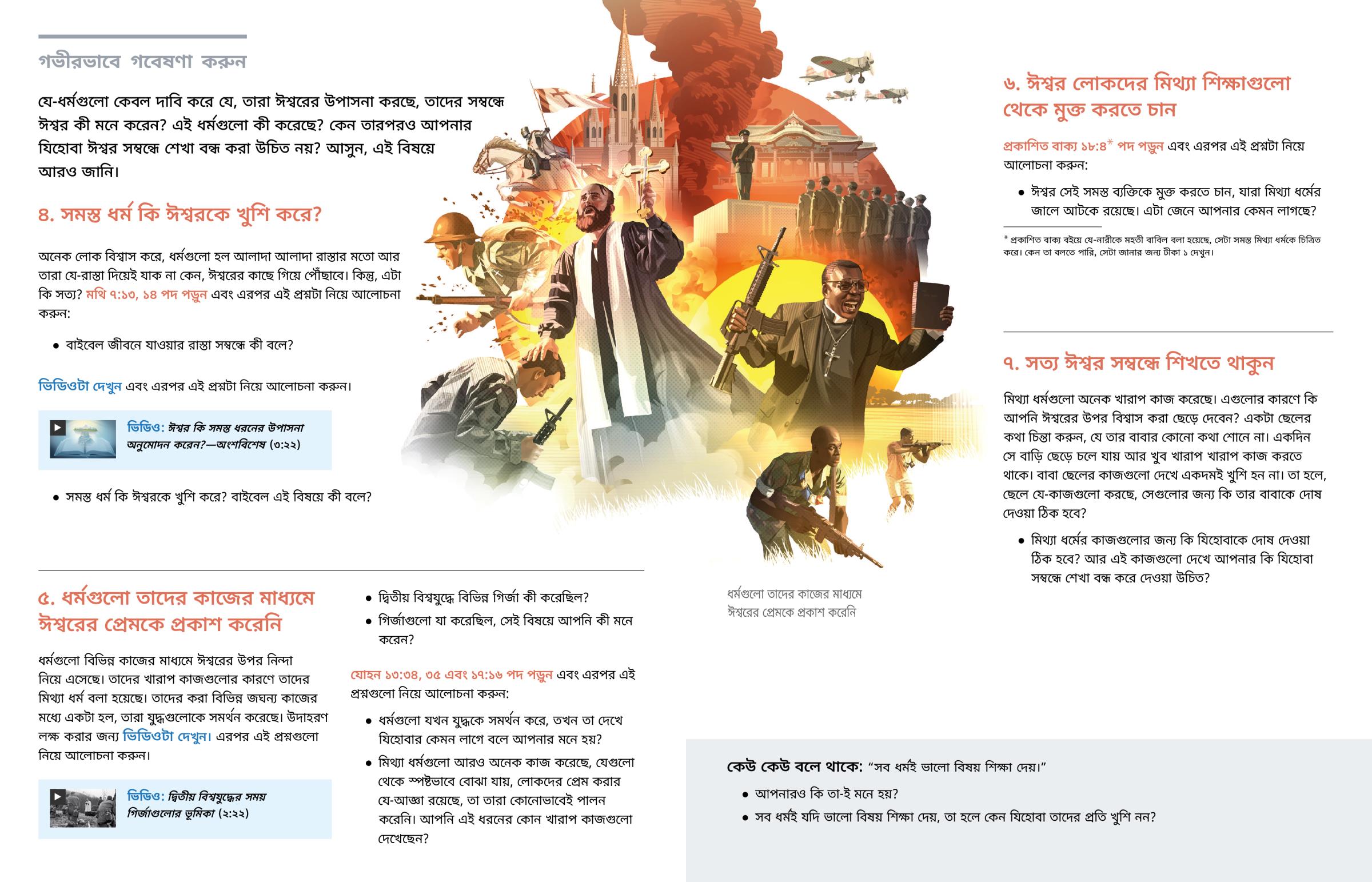 ধর্মগুলো বিভিন্ন কাজের মাধ্যমে ঈশ্বরের উপর নিন্দা নিয়ে এসেছে। তাদের খারাপ কাজগুলোর কারণে তাদের মিথ্যা ধর্ম বলা হয়েছে। তাদের করা বিভিন্ন জঘন্য কাজের মধ্যে একটা হল, তারা যুদ্ধগুলোকে সমর্থন করেছে। উদাহরণ লক্ষ করার জন্য ভিডিওটা দেখুন। এরপর এই প্রশ্নগুলো নিয়ে আলোচনা করুন।