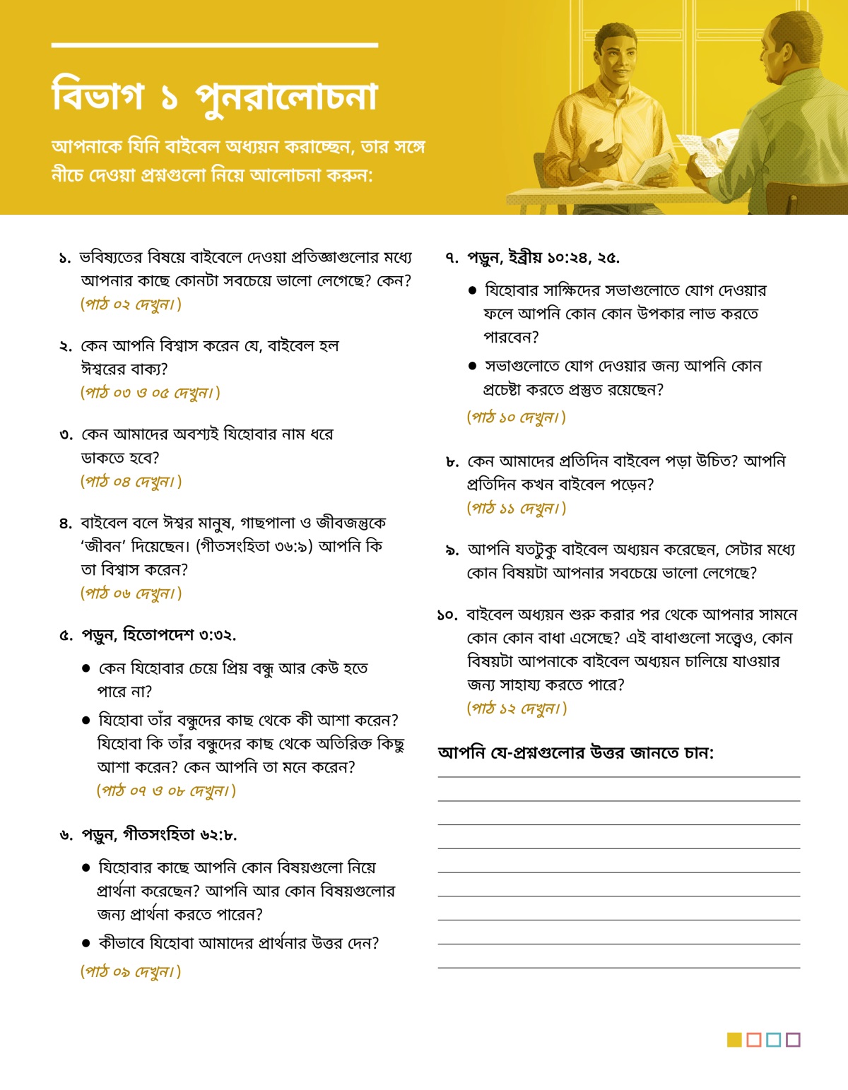 আপনাকে যিনি বাইবেল অধ্যয়ন করাচ্ছেন, তার সঙ্গে নীচে দেওয়া প্রশ্নগুলো নিয়ে আলোচনা করুন: