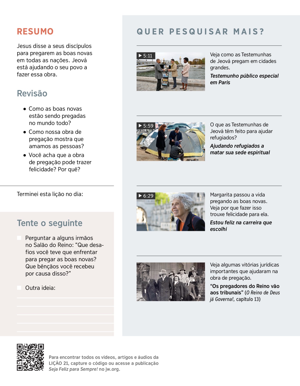 As Testemunhas de Jeová se esforçam bastante para pregar as boas novas para as pessoas em todo lugar. Assistam ao VÍDEO. Depois conversem sobre o ponto a seguir: