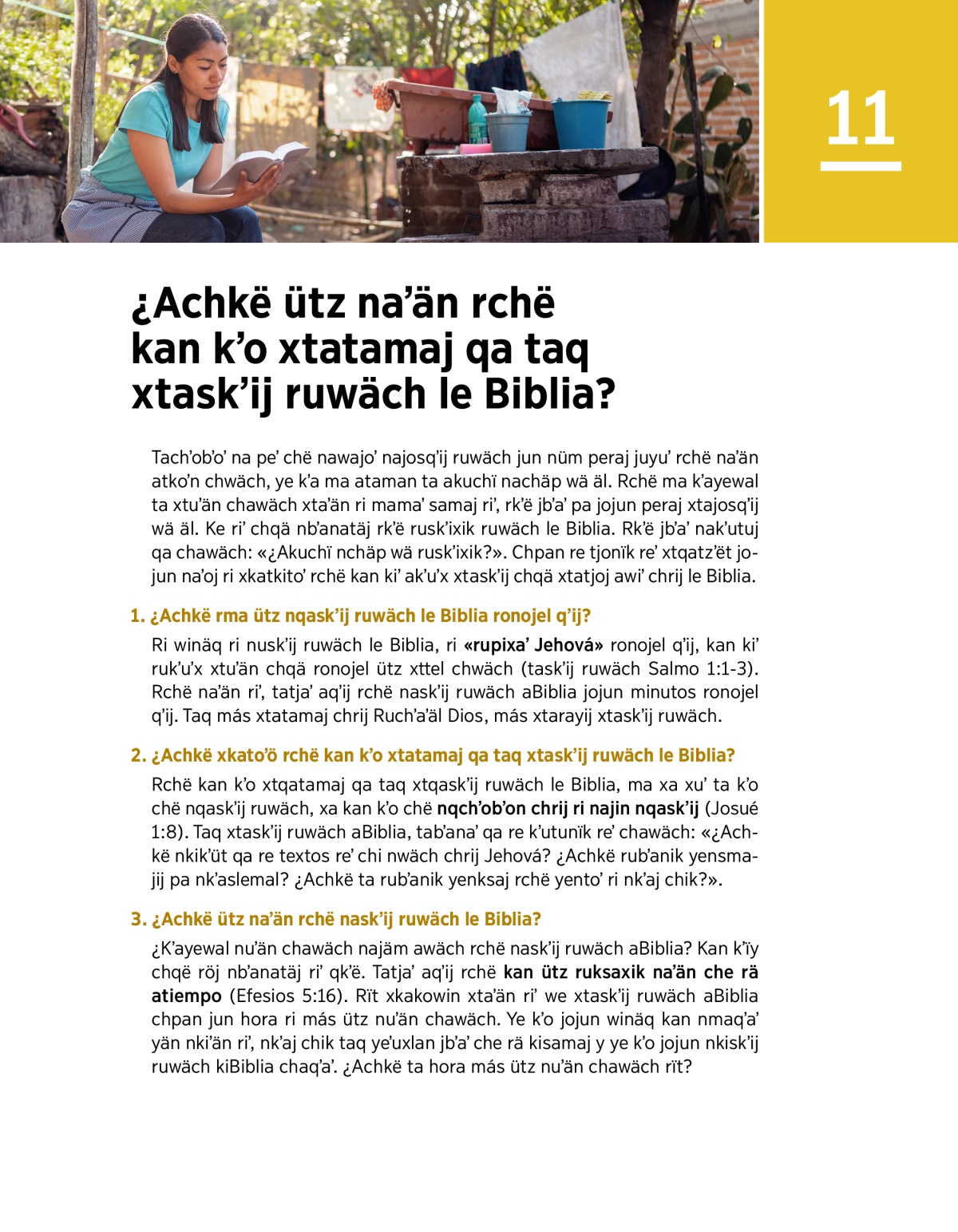 Rchë kan kʼo xtqatamaj qa taq xtqaskʼij ruwäch le Biblia, ma xa xuʼ ta kʼo chë nqaskʼij ruwäch, xa kan kʼo chë nqchʼobʼon chrij ri najin nqaskʼij (Josué 1:8). Taq xtaskʼij ruwäch aBiblia, tabʼanaʼ qa re kʼutunïk reʼ chawäch: «¿Achkë nkikʼüt qa re textos reʼ chi nwäch chrij Jehová? ¿Achkë rubʼanik yensmajij pa nkʼaslemal? ¿Achkë ta rubʼanik yenksaj rchë yentoʼ ri nkʼaj chik?».