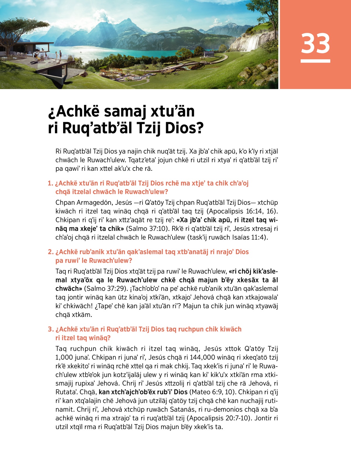 Taq ri Ruqʼatbʼäl Tzij Dios xtqʼät tzij pa ruwiʼ le Ruwachʼulew, «ri chöj kikʼaslemal xtyaʼöx qa le Ruwachʼulew chkë chqä majun bʼëy xkesäx ta äl chwäch» (Salmo 37:29). ¡Tachʼobʼoʼ na peʼ achkë rubʼanik xtuʼän qakʼaslemal taq jontir winäq kan ütz kinaʼoj xtkiʼän, xtkajoʼ Jehová chqä kan xtkajowalaʼ kiʼ chkiwäch! ¿Tapeʼ chë kan jaʼäl xtuʼän riʼ? Majun ta chik jun winäq xtyawäj chqä xtkäm.