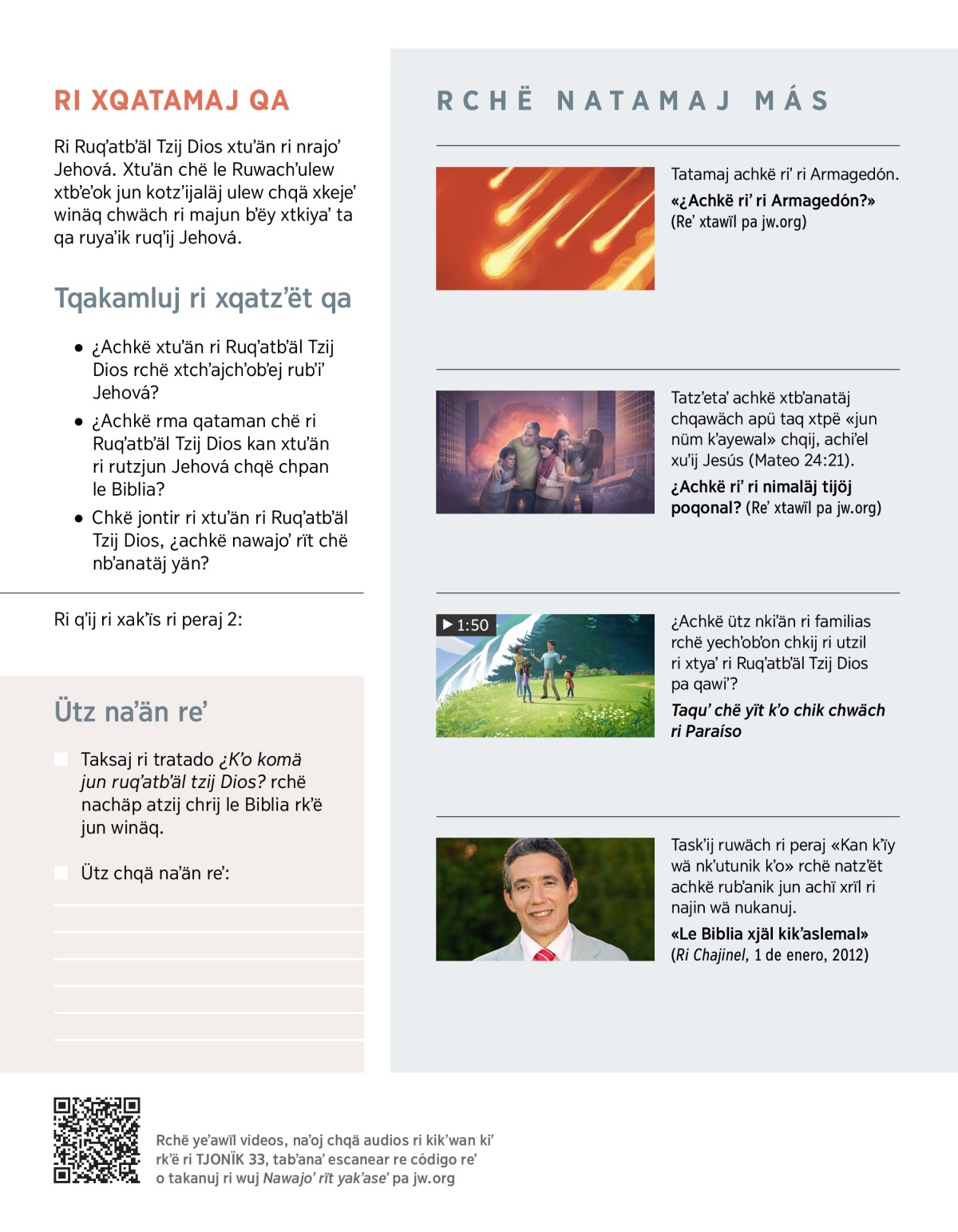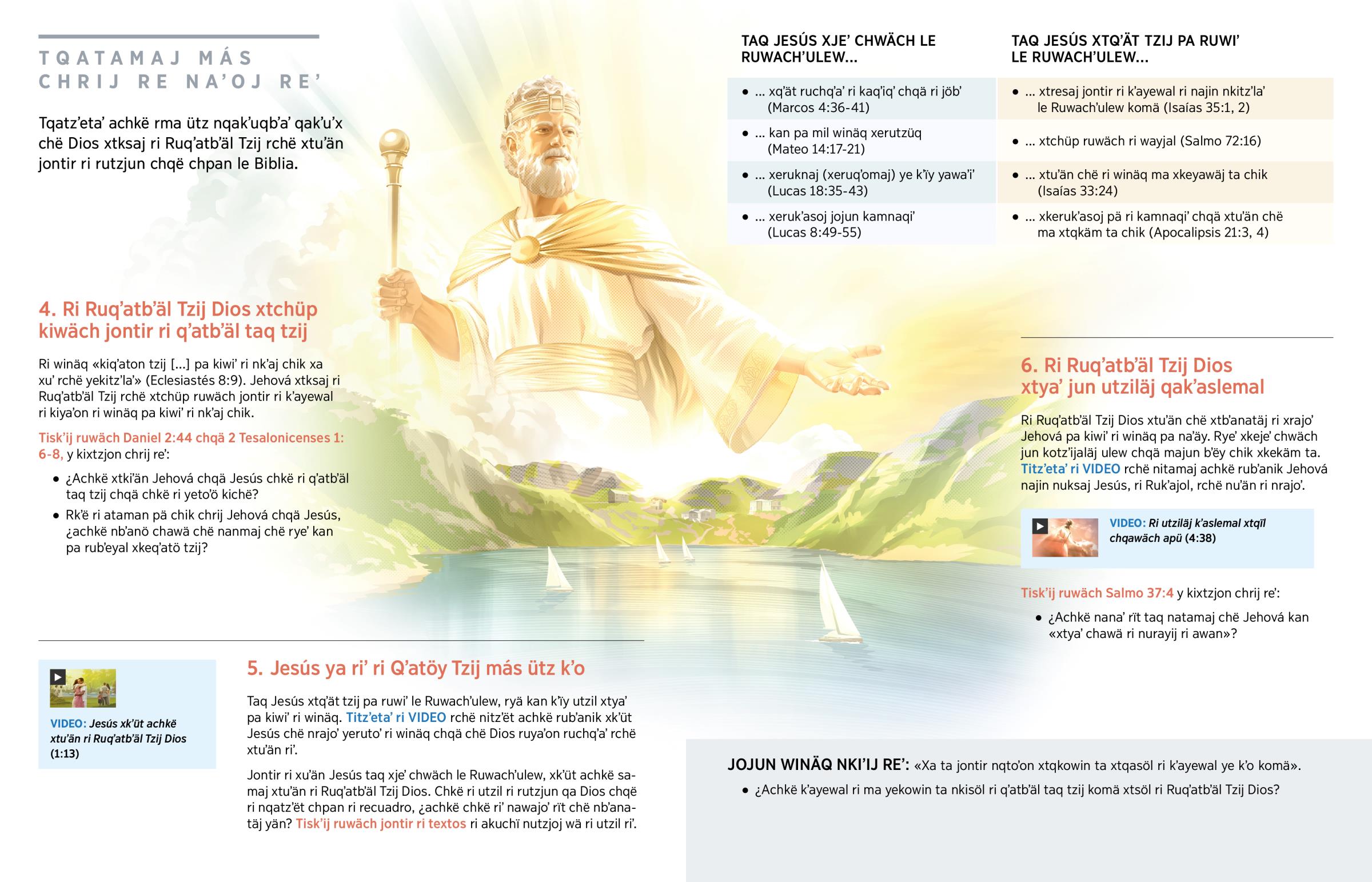 Ri Ruqʼatbʼäl Tzij Dios xtuʼän chë xtbʼanatäj ri xrajoʼ Jehová pa kiwiʼ ri winäq pa naʼäy. Ryeʼ xkejeʼ chwäch jun kotzʼijaläj ulew chqä majun bʼëy chik xkekäm ta. Titzʼetaʼ ri VIDEO rchë nitamaj achkë rubʼanik Jehová najin nuksaj Jesús, ri Rukʼajol, rchë nuʼän ri nrajoʼ.