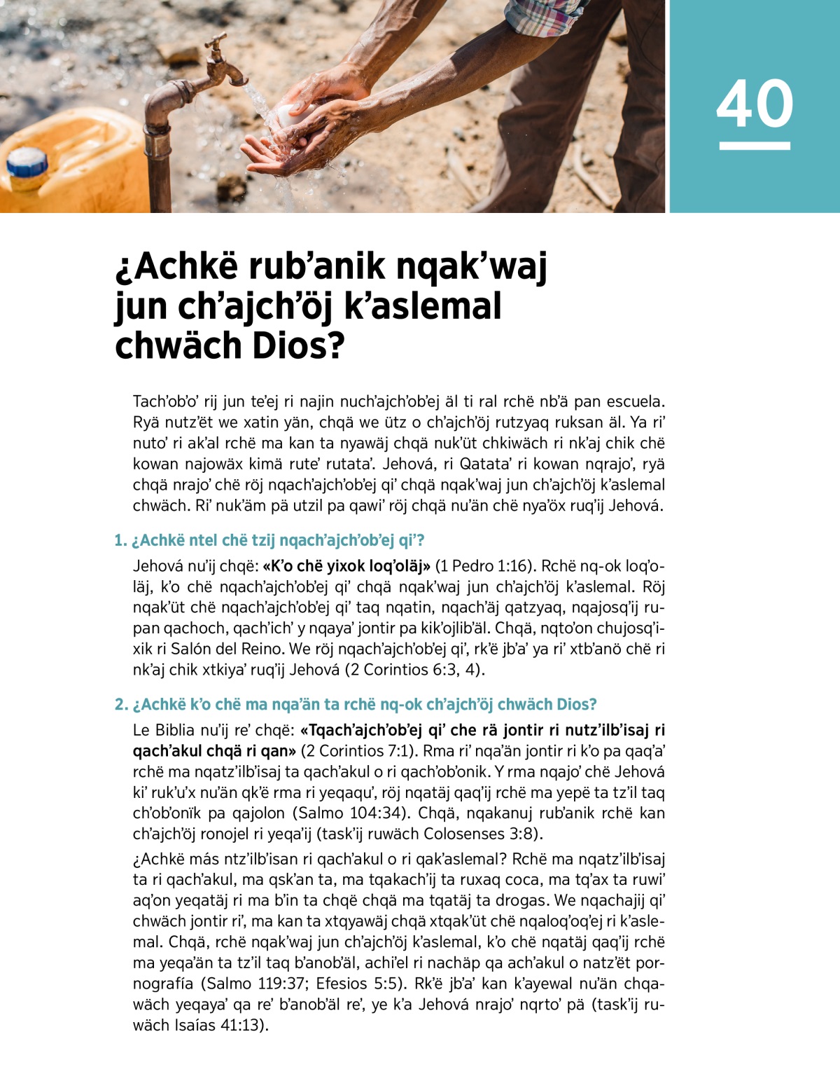 Le Biblia nuʼij reʼ chqë: «Tqachʼajchʼobʼej qiʼ che rä jontir ri nutzʼilbʼisaj ri qachʼakul chqä ri qan» (2 Corintios 7:1). Rma riʼ nqaʼän jontir ri kʼo pa qaqʼaʼ rchë ma nqatzʼilbʼisaj ta qachʼakul o ri qachʼobʼonik. Y rma nqajoʼ chë Jehová kiʼ rukʼuʼx nuʼän qkʼë rma ri yeqaquʼ, röj nqatäj qaqʼij rchë ma yepë ta tzʼil taq chʼobʼonïk pa qajolon (Salmo 104:34). Chqä, nqakanuj rubʼanik rchë kan chʼajchʼöj ronojel ri yeqaʼij (taskʼij ruwäch Colosenses 3:8).