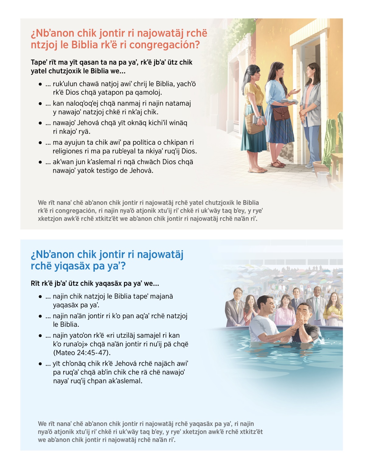 We rït nanaʼ chë abʼanon chik jontir ri najowatäj rchë yatel chutzjoxik le Biblia rkʼë ri congregación, ri najin nyaʼö atjonik xtuʼij riʼ chkë ri ukʼwäy taq bʼey, y ryeʼ xketzjon awkʼë rchë xtkitzʼët we abʼanon chik jontir ri najowatäj rchë naʼän riʼ.
