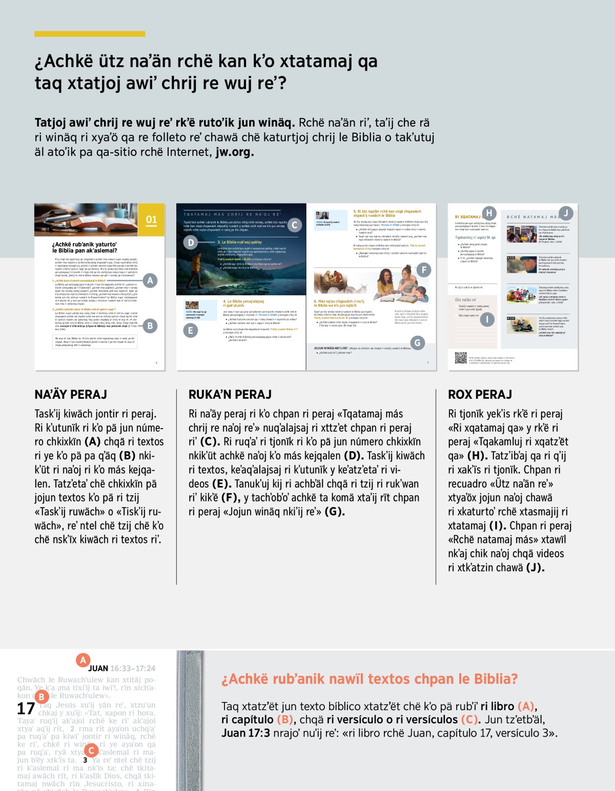 Taq xtatzʼët jun texto bíblico xtatzʼët chë kʼo pä rubʼiʼ ri libro (A), ri capítulo (B), chqä ri versículo o ri versículos (C). Jun tzʼetbʼäl, Juan 17:3 nrajoʼ nuʼij reʼ: «ri libro rchë Juan, capítulo 17, versículo 3».