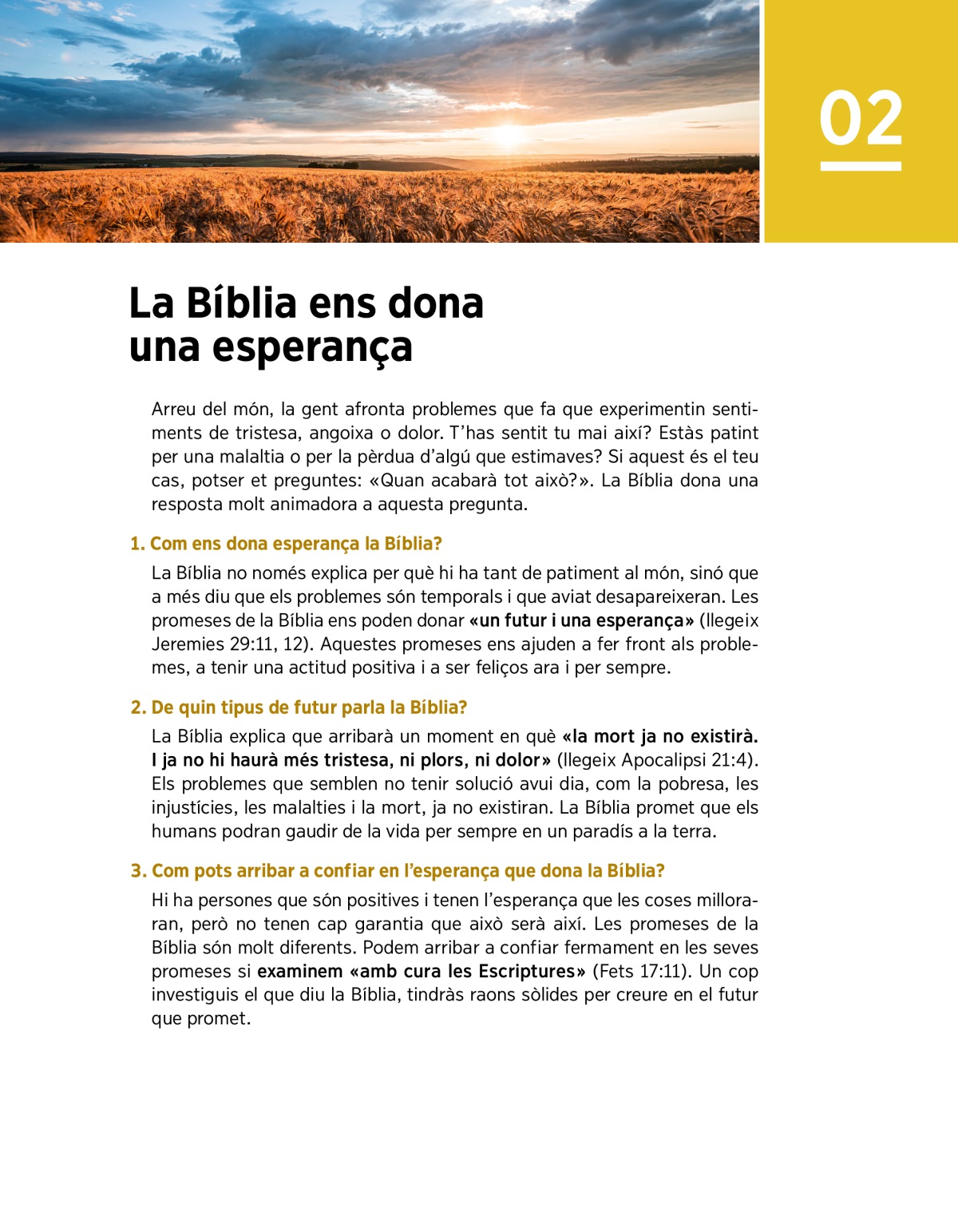 La Bíblia no només explica per què hi ha tant de patiment al món, sinó que a més diu que els problemes són temporals i que aviat desapareixeran. Les promeses de la Bíblia ens poden donar «un futur i una esperança» (llegeix Jeremies 29:11, 12). Aquestes promeses ens ajuden a fer front als problemes, a tenir una actitud positiva i a ser feliços ara i per sempre.