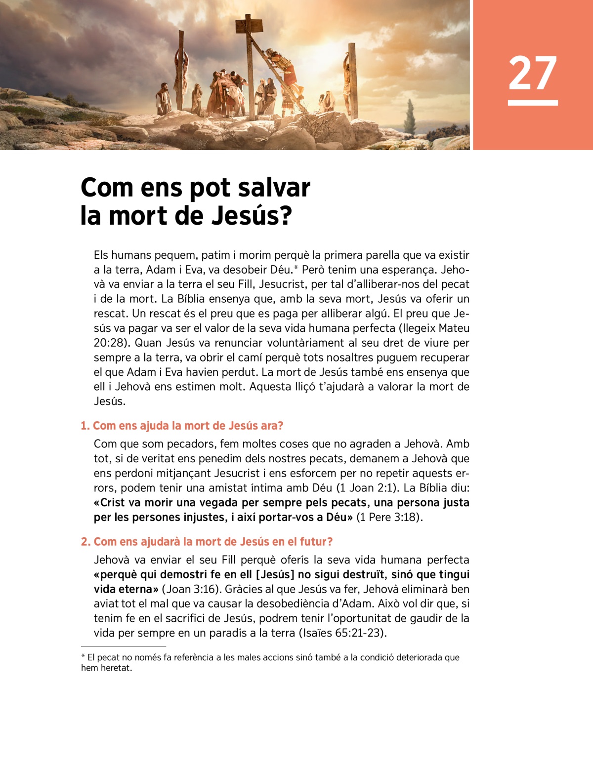 Els humans pequem, patim i morim perquè la primera parella que va existir a la terra, Adam i Eva, va desobeir Déu.a Però tenim una esperança. Jehovà va enviar a la terra el seu Fill, Jesucrist, per tal d’alliberar-nos del pecat i de la mort. La Bíblia ensenya que, amb la seva mort, Jesús va oferir un rescat. Un rescat és el preu que es paga per alliberar algú. El preu que Jesús va pagar va ser el valor de la seva vida humana perfecta (llegeix Mateu 20:28). Quan Jesús va renunciar voluntàriament al seu dret de viure per sempre a la terra, va obrir el camí perquè tots nosaltres puguem recuperar el que Adam i Eva havien perdut. La mort de Jesús també ens ensenya que ell i Jehovà ens estimen molt. Aquesta lliçó t’ajudarà a valorar la mort de Jesús.
