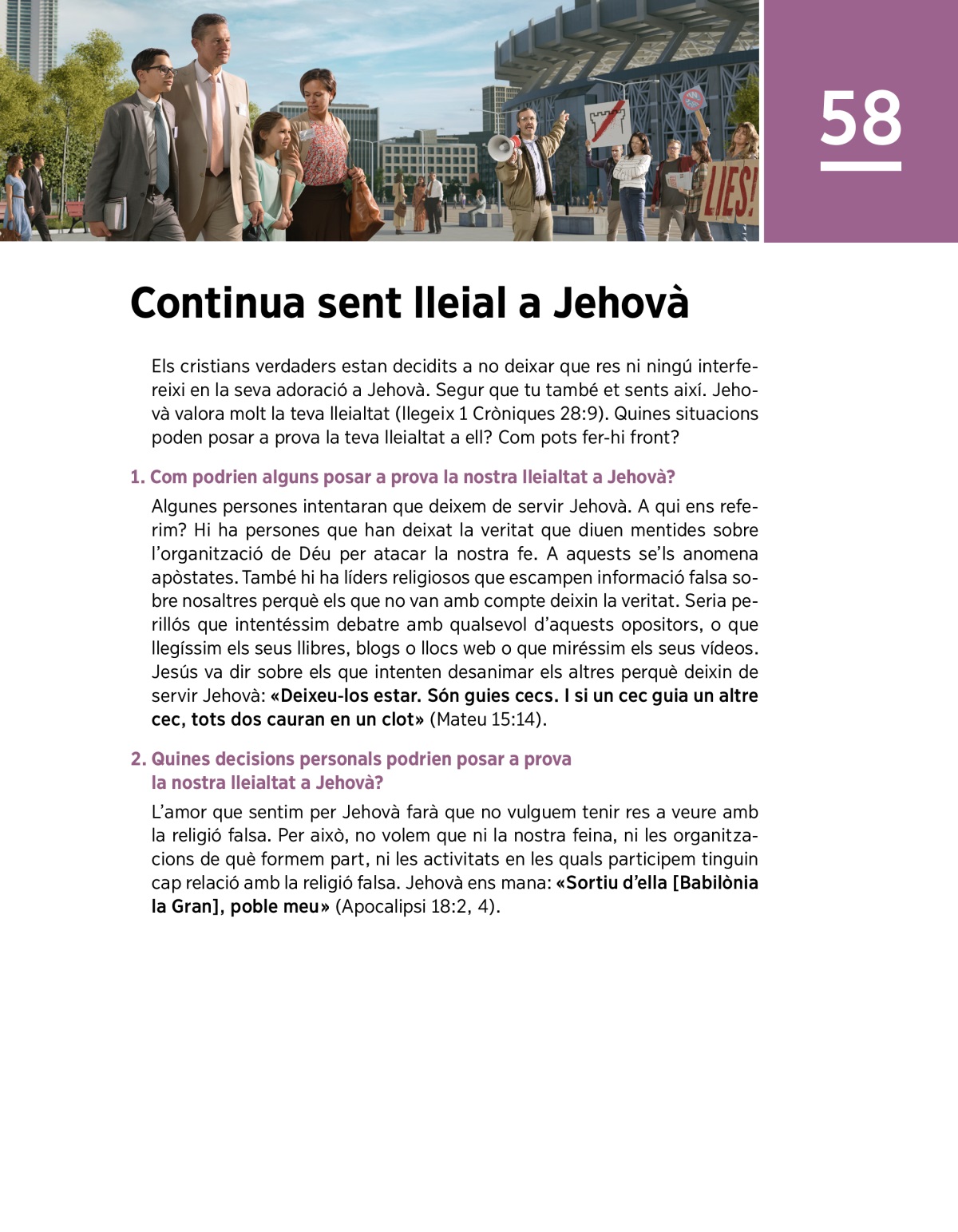 Els cristians verdaders estan decidits a no deixar que res ni ningú interfereixi en la seva adoració a Jehovà. Segur que tu també et sents així. Jehovà valora molt la teva lleialtat (llegeix 1 Cròniques 28:9). Quines situacions poden posar a prova la teva lleialtat a ell? Com pots fer-hi front?