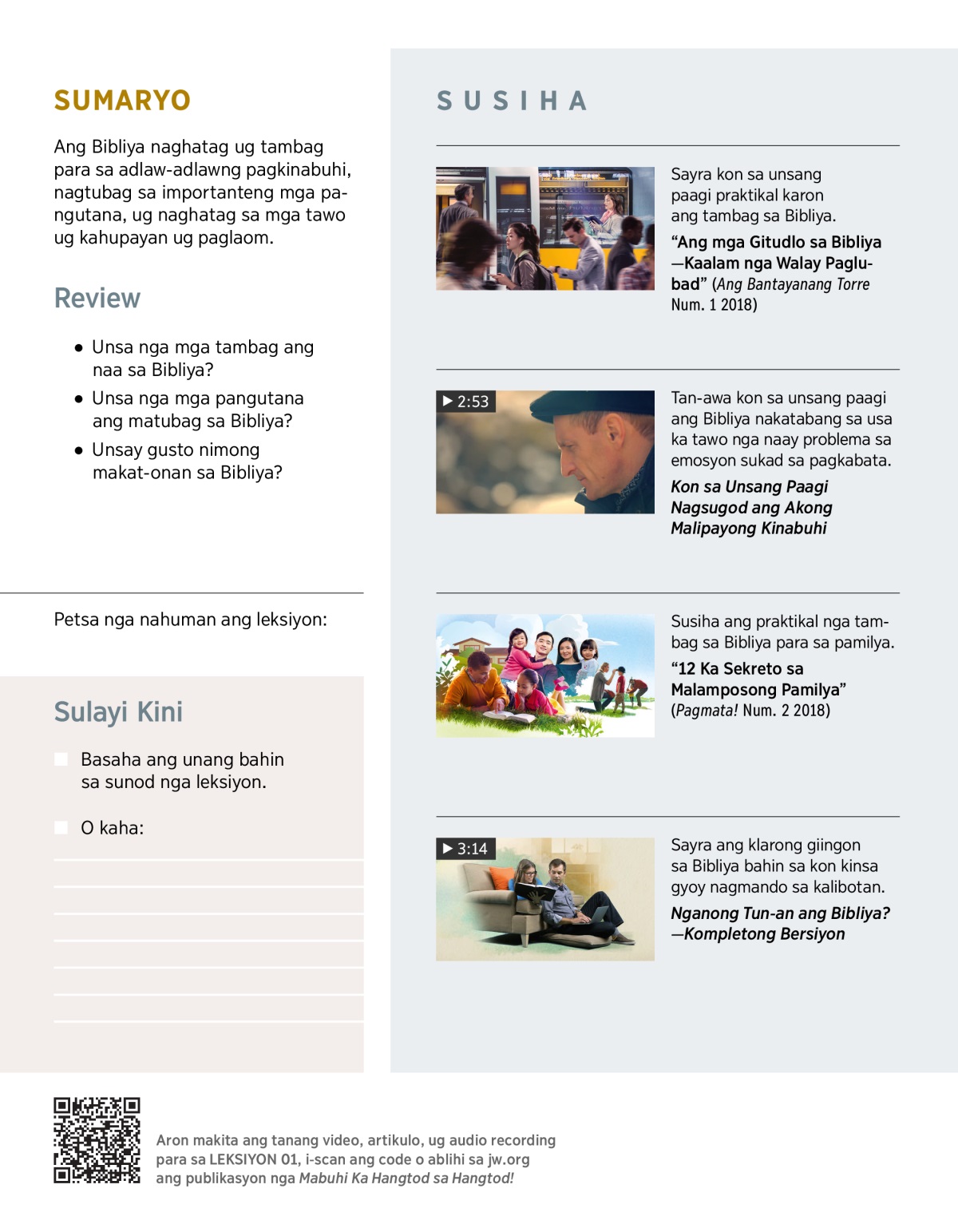 Kini nga publikasyon dili kapuli sa Bibliya. Hinuon, dasigon ka niini sa pagsusi sa Bibliya. Busa palihog basaha ang mga teksto diha sa mga leksiyon ug ikomparar kini sa mga butang nga imong makat-onan.