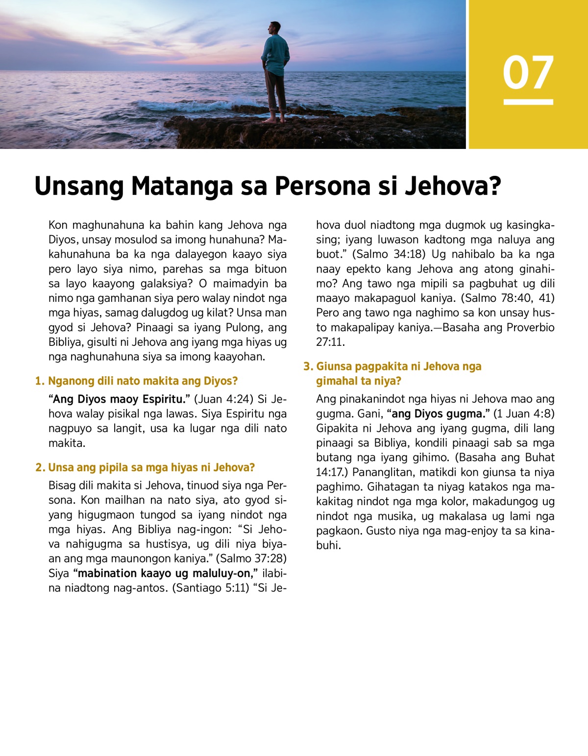 Kon maghunahuna ka bahin kang Jehova nga Diyos, unsay mosulod sa imong hunahuna? Makahunahuna ba ka nga dalayegon kaayo siya pero layo siya nimo, parehas sa mga bituon sa layo kaayong galaksiya? O maimadyin ba nimo nga gamhanan siya pero walay nindot nga mga hiyas, samag dalugdog ug kilat? Unsa man gyod si Jehova? Pinaagi sa iyang Pulong, ang Bibliya, gisulti ni Jehova ang iyang mga hiyas ug nga naghunahuna siya sa imong kaayohan.