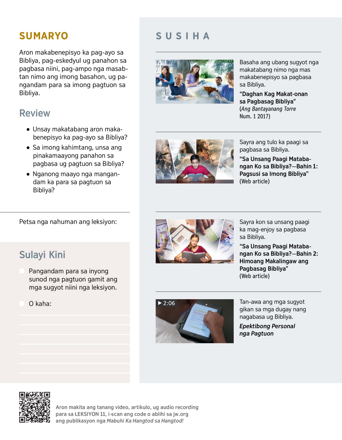 Sa unsang paagi ka makabenepisyo pag-ayo sa matag pagtuon? Samtang mangandam ka sa kada leksiyon niini nga pagtuon, sulayi ang mosunod: