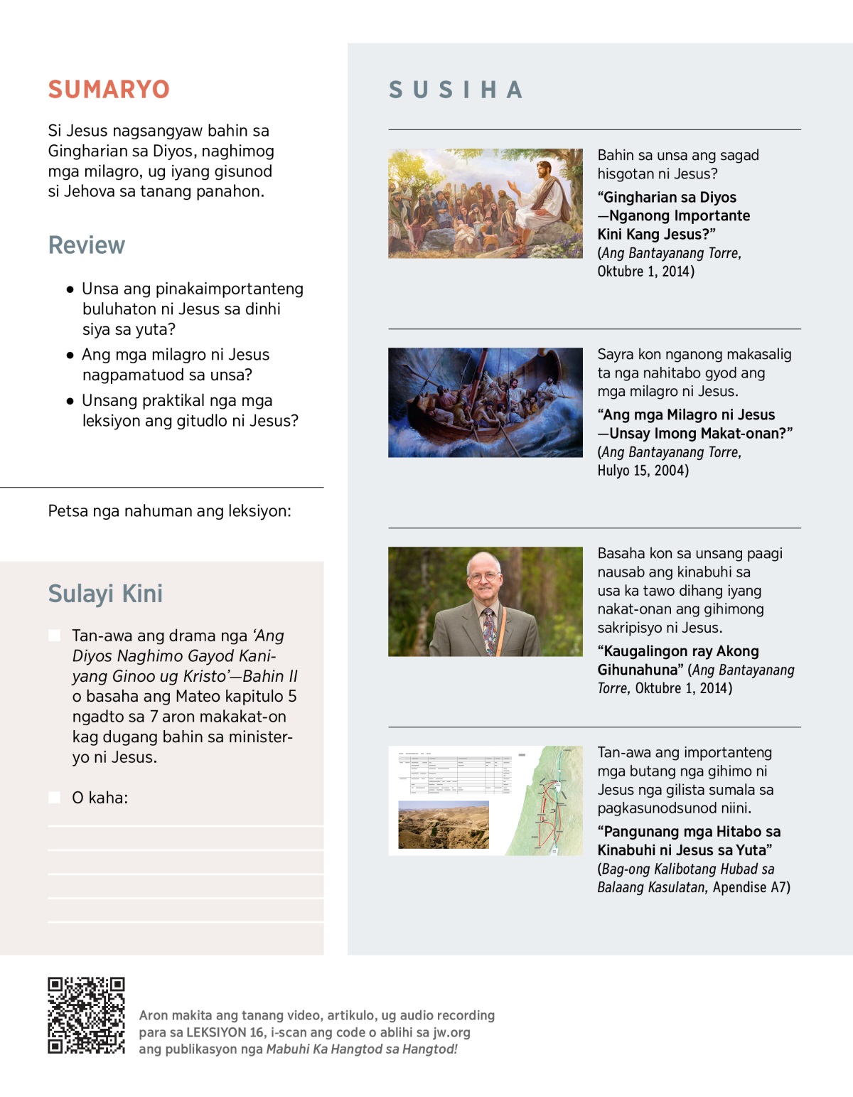 Dihang maghunahuna ang mga tawo bahin kang Jesus, ang ilang mahunahunaan mao nga siya atimanonon nga bata, maalamon nga propeta o, himalatyon nga tawo. Pero naa pa ba tay makat-onan bahin niya kon atong susihon ang iyang kinabuhi sa yuta? Niini nga leksiyon, hisgotan nato ang pipila sa pinakaimportanteng butang nga gihimo ni Jesus ug kon sa unsang paagi ni makatabang nimo.