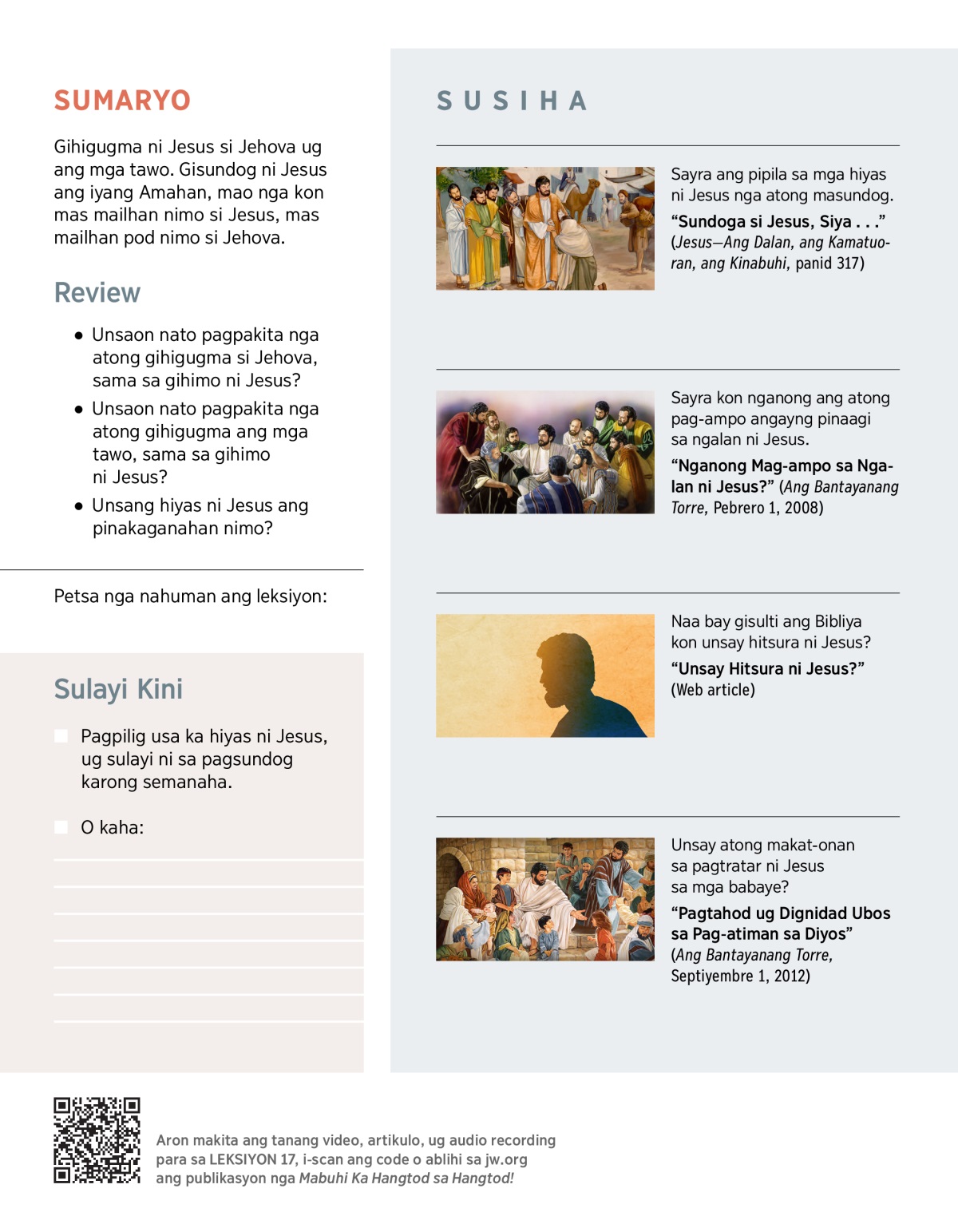 Gihigugma ni Jesus si Jehova ug ang mga tawo. Gisundog ni Jesus ang iyang Amahan, mao nga kon mas mailhan nimo si Jesus, mas mailhan pod nimo si Jehova.