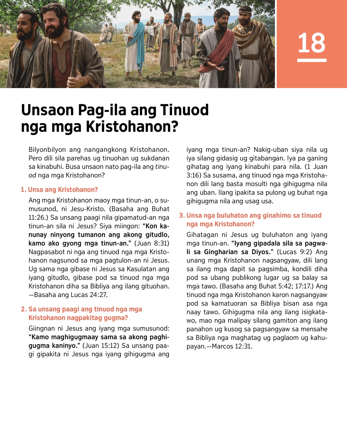 Ang mga Kristohanon maoy mga tinun-an, o sumusunod, ni Jesu-Kristo. (Basaha ang Buhat 11:26.) Sa unsang paagi nila gipamatud-an nga tinun-an sila ni Jesus? Siya miingon: “Kon kanunay ninyong tumanon ang akong gitudlo, kamo ako gyong mga tinun-an.” (Juan 8:31) Nagpasabot ni nga ang tinuod nga mga Kristohanon nagsunod sa mga pagtulon-an ni Jesus. Ug sama nga gibase ni Jesus sa Kasulatan ang iyang gitudlo, gibase pod sa tinuod nga mga Kristohanon diha sa Bibliya ang ilang gituohan.—Basaha ang Lucas 24:27.