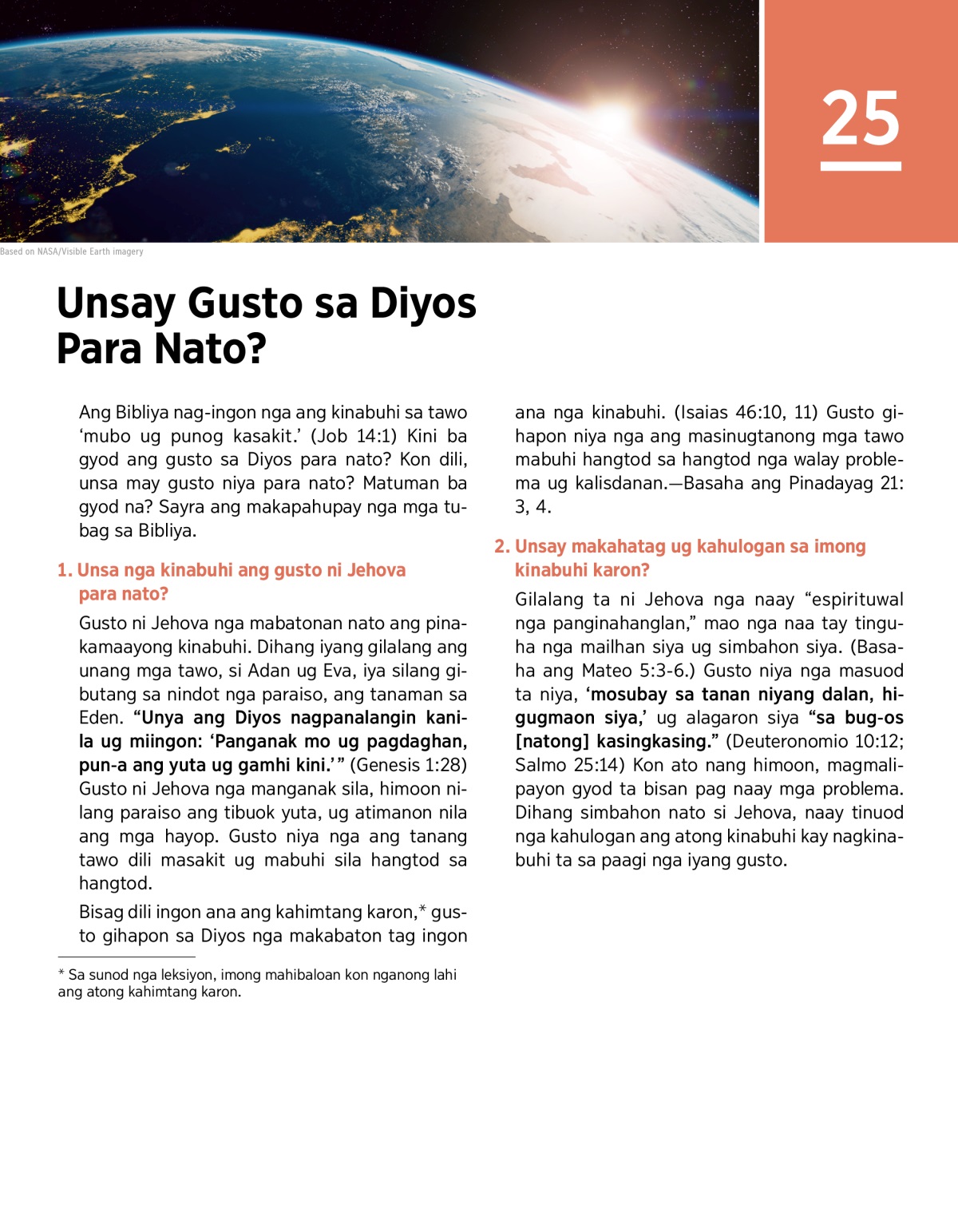 Bisag dili ingon ana ang kahimtang karon,a gusto gihapon sa Diyos nga makabaton tag ingon ana nga kinabuhi. (Isaias 46:10, 11) Gusto gihapon niya nga ang masinugtanong mga tawo mabuhi hangtod sa hangtod nga walay problema ug kalisdanan.—Basaha ang Pinadayag 21:3, 4.