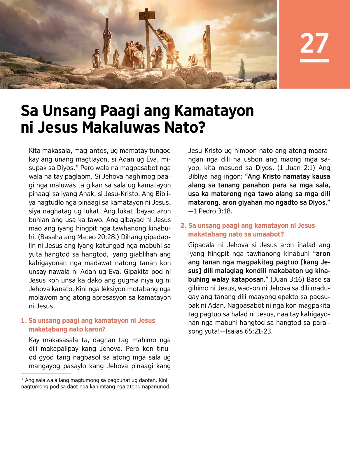 Ang kamatayon ni Jesus naghatag ug basehanan aron pasayloon ni Jehova ang atong mga sala, ug naghatag pod nig kahigayonan nga mabuhi ta hangtod sa hangtod.