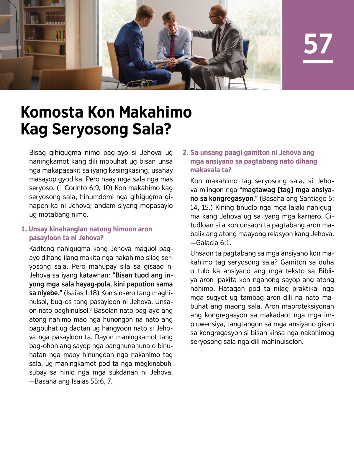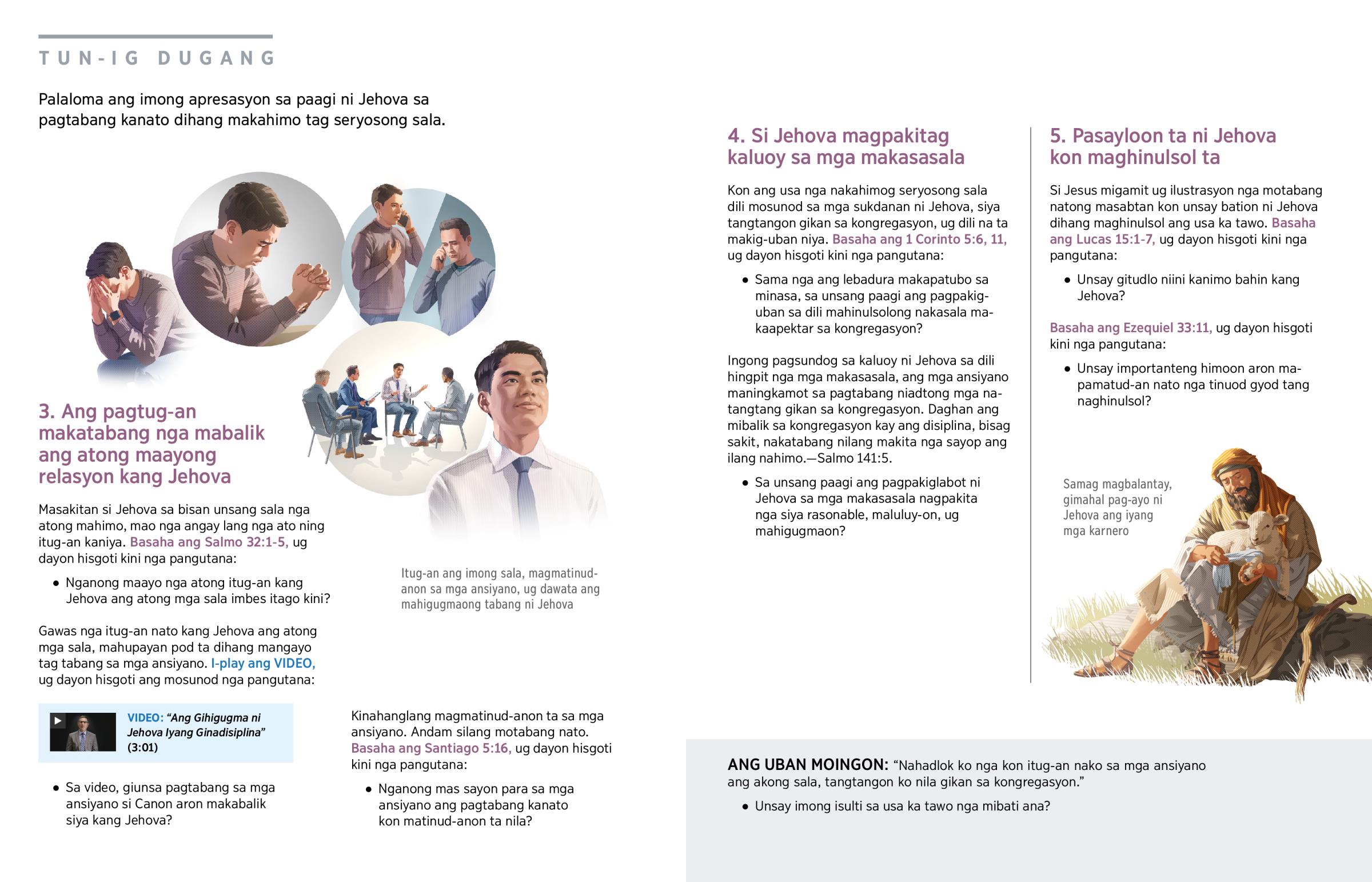 Unsaon ta pagtabang sa mga ansiyano kon makahimo tag seryosong sala? Gamiton sa duha o tulo ka ansiyano ang mga teksto sa Bibliya aron ipakita kon nganong sayop ang atong nahimo. Hatagan pod ta nilag praktikal nga mga sugyot ug tambag aron dili na nato mabuhat ang maong sala. Aron maproteksiyonan ang kongregasyon sa makadaot nga mga impluwensiya, tangtangon sa mga ansiyano gikan sa kongregasyon si bisan kinsa nga nakahimog seryosong sala nga dili mahinulsolon.