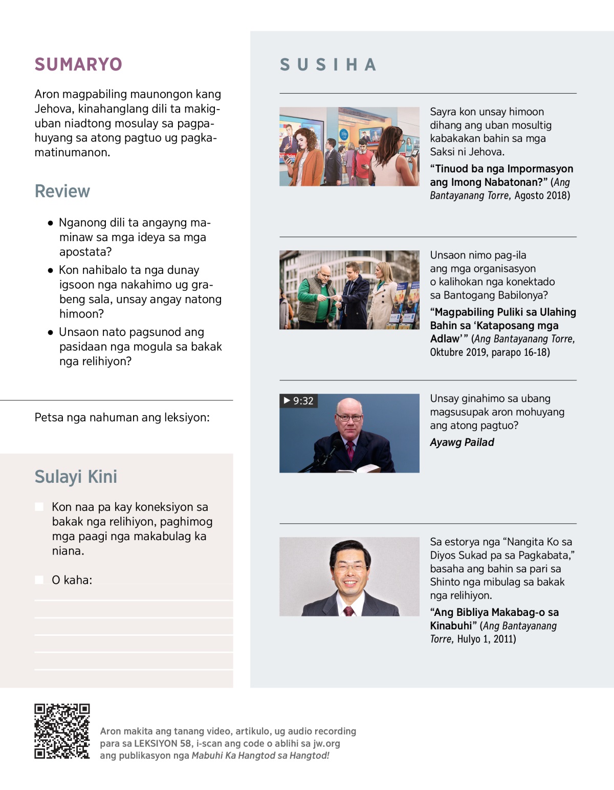Tungod sa atong gugma kang Jehova, likayan nato ang bisan unsa nga konektado sa bakak nga relihiyon. Ang atong trabaho, ang mga organisasyon nga atong giapilan, o ang bisan unsa nga atong ginahimo angayng dili konektado sa bakak nga relihiyon. Gipasidan-an ta ni Jehova: “Gula mo [sa Bantogang Babilonya], akong katawhan.”—Pinadayag 18:2, 4.