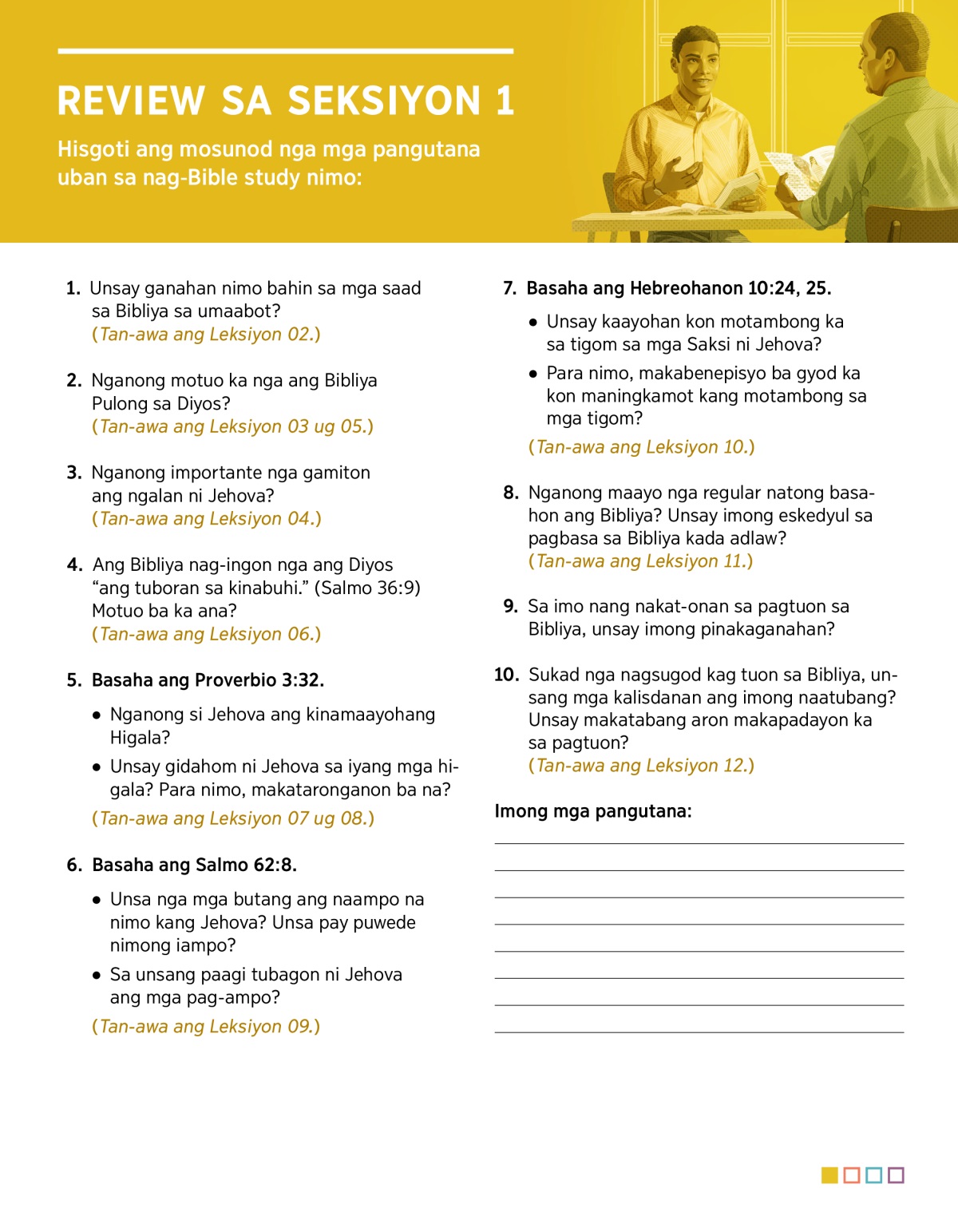 Hisgoti ang mosunod nga mga pangutana uban sa nag-Bible study nimo: