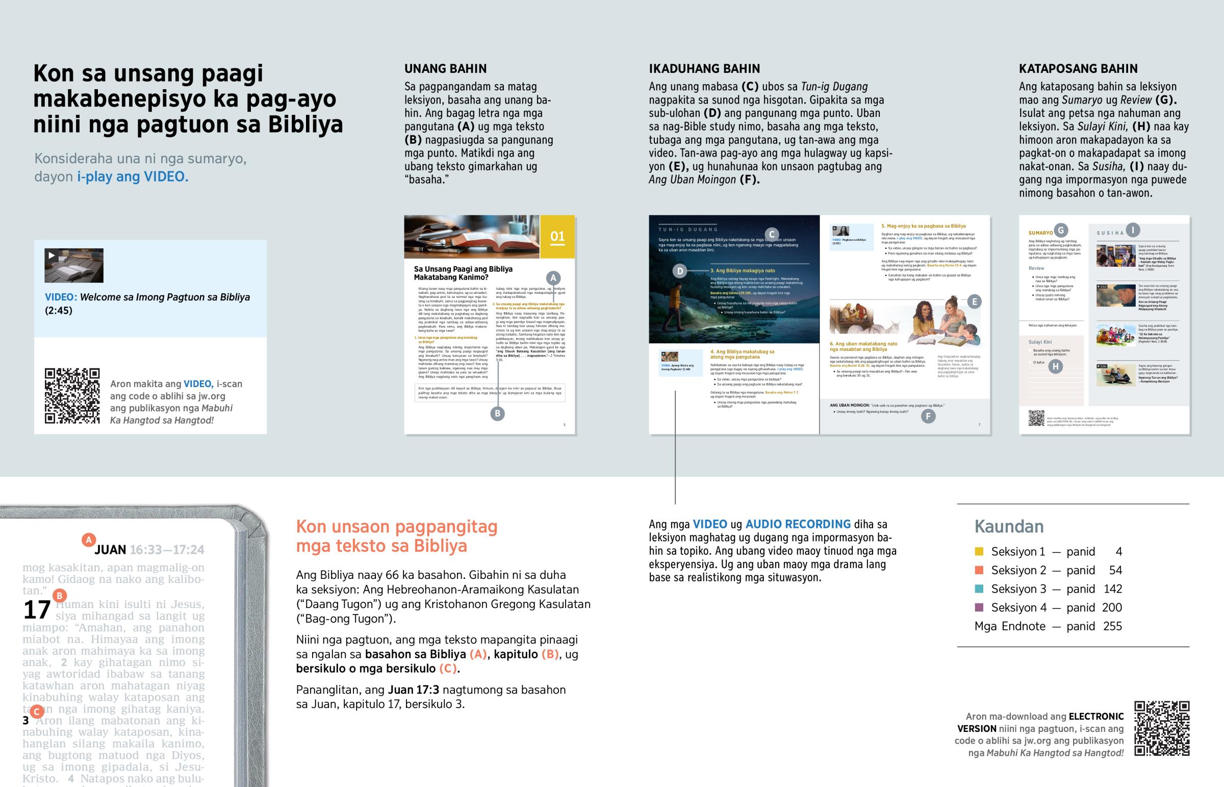 Sa pagpangandam sa matag leksiyon, basaha ang unang bahin. Ang bagag letra nga mga pangutana (A) ug mga teksto (B) nagpasiugda sa pangunang mga punto. Matikdi nga ang ubang teksto gimarkahan ug “basaha.”