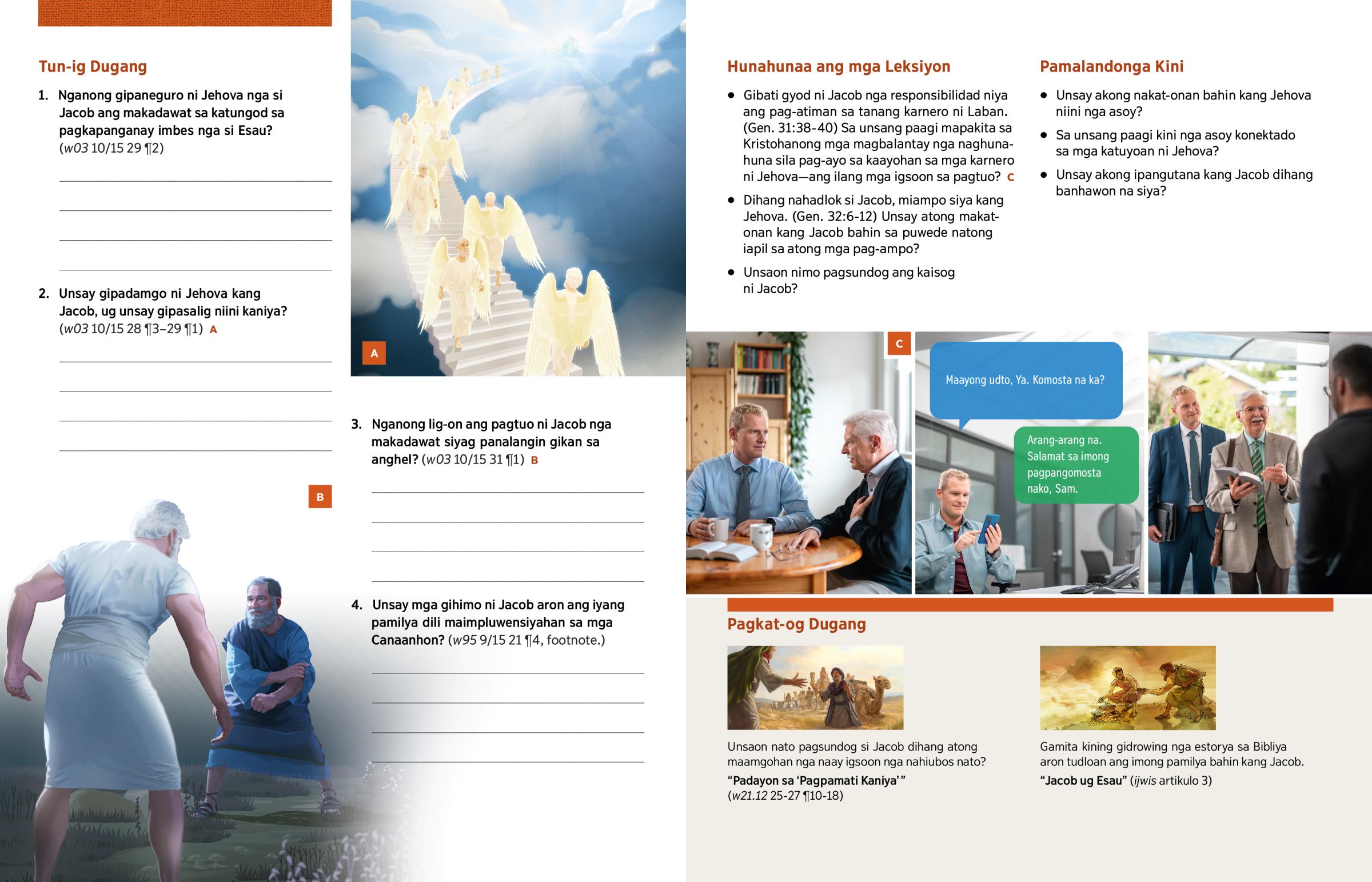 3. Nganong lig-on ang pagtuo ni Jacob nga makadawat siyag panalangin gikan sa anghel? (w03 10/15 31 ¶1) B