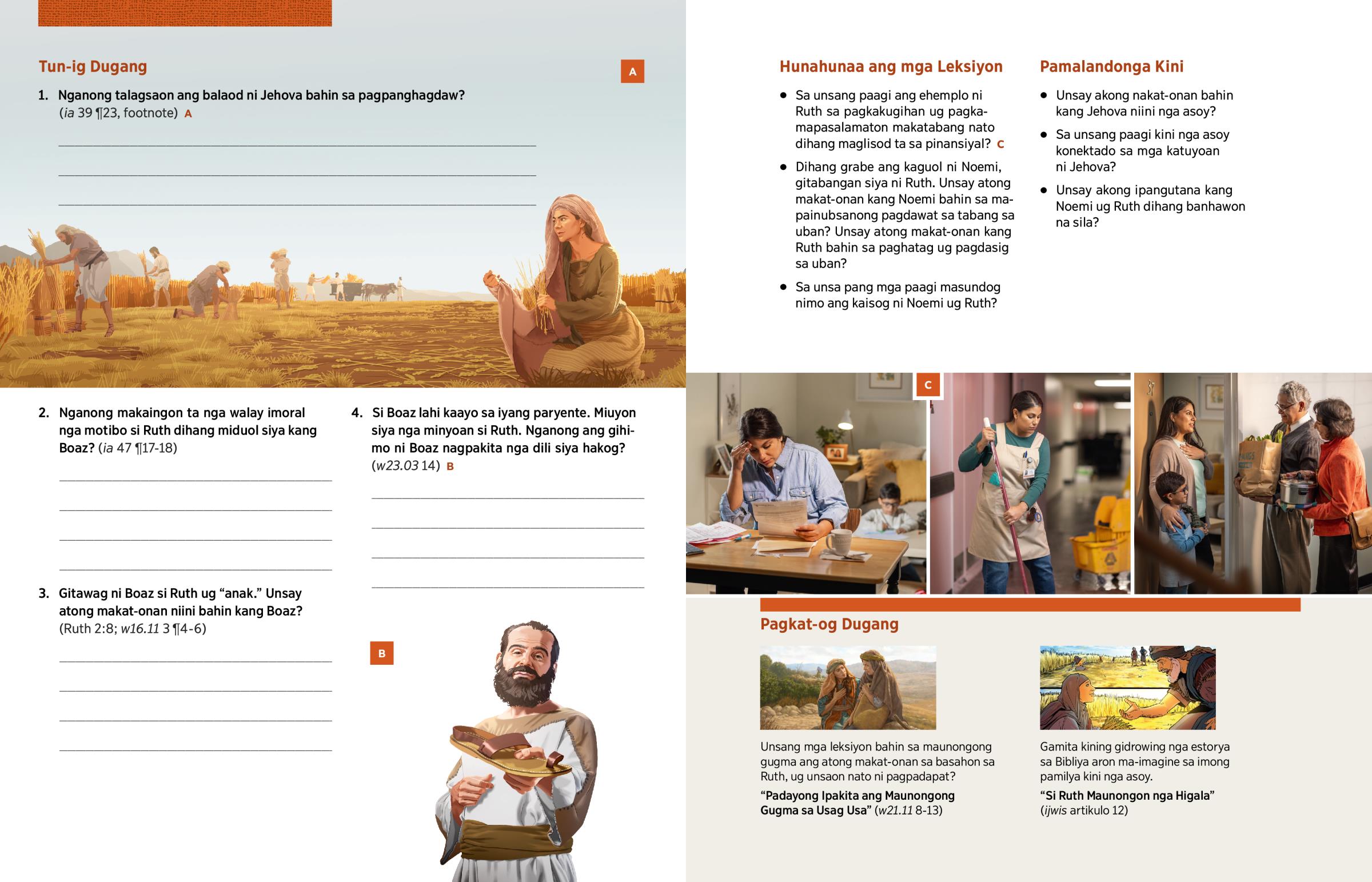 4. Si Boaz lahi kaayo sa iyang paryente. Miuyon siya nga minyoan si Ruth. Nganong ang gihimo ni Boaz nagpakita nga dili siya hakog? (w23.03 14) B