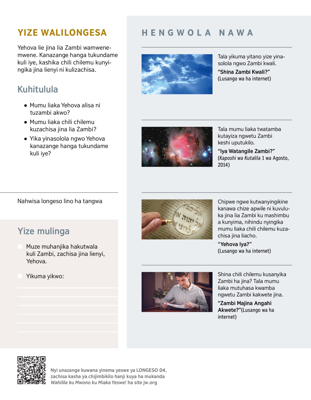 Nyingika kalisa watwama hakachi ka chisanyiko Zambi ni jina lienyi, Yehova. Nyingika nawa chize Zambi akusolwela jina lienyi ni mumu liaka alinga chocho.