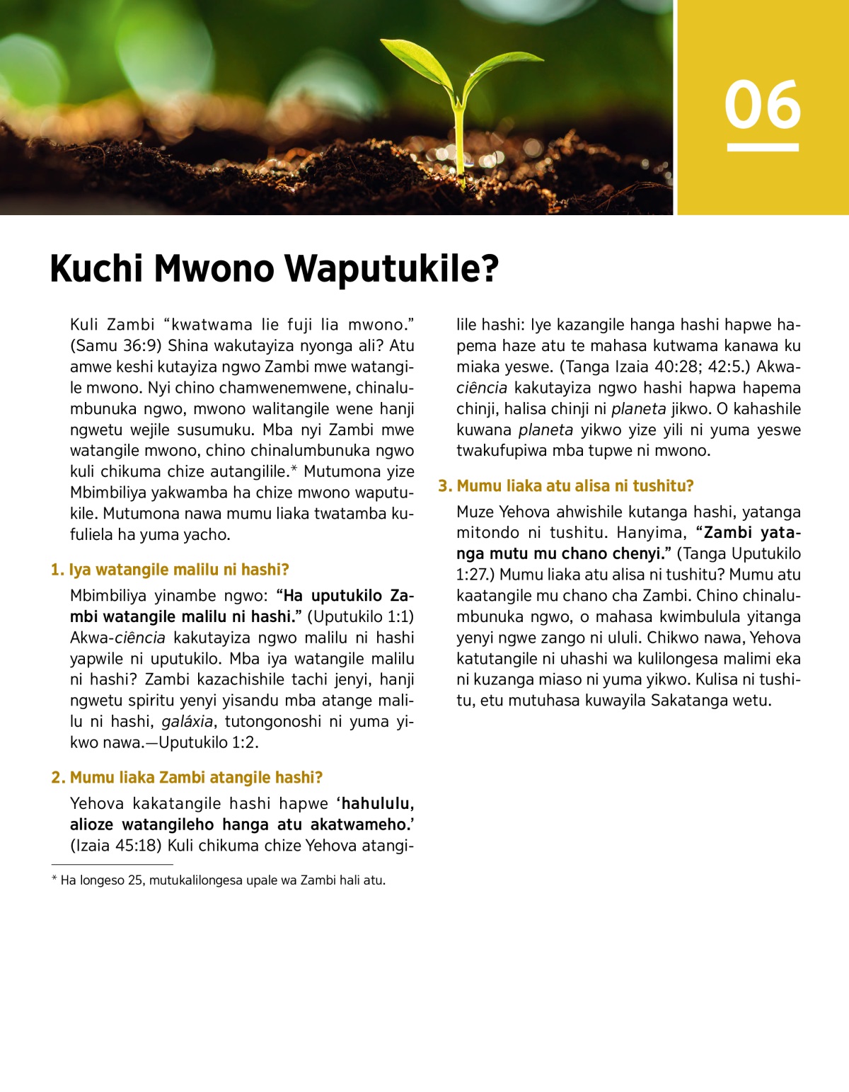 Kuli Zambi “kwatwama lie fuji lia mwono.” (Samu 36:9) Shina wakutayiza nyonga ali? Atu amwe keshi kutayiza ngwo Zambi mwe watangile mwono. Nyi chino chamwenemwene, chinalumbunuka ngwo, mwono walitangile wene hanji ngwetu wejile susumuku. Mba nyi Zambi mwe watangile mwono, chino chinalumbunuka ngwo kuli chikuma chize autangilile.a Mutumona yize Mbimbiliya yakwamba ha chize mwono waputukile. Mutumona nawa mumu liaka twatamba kufuliela ha yuma yacho.
