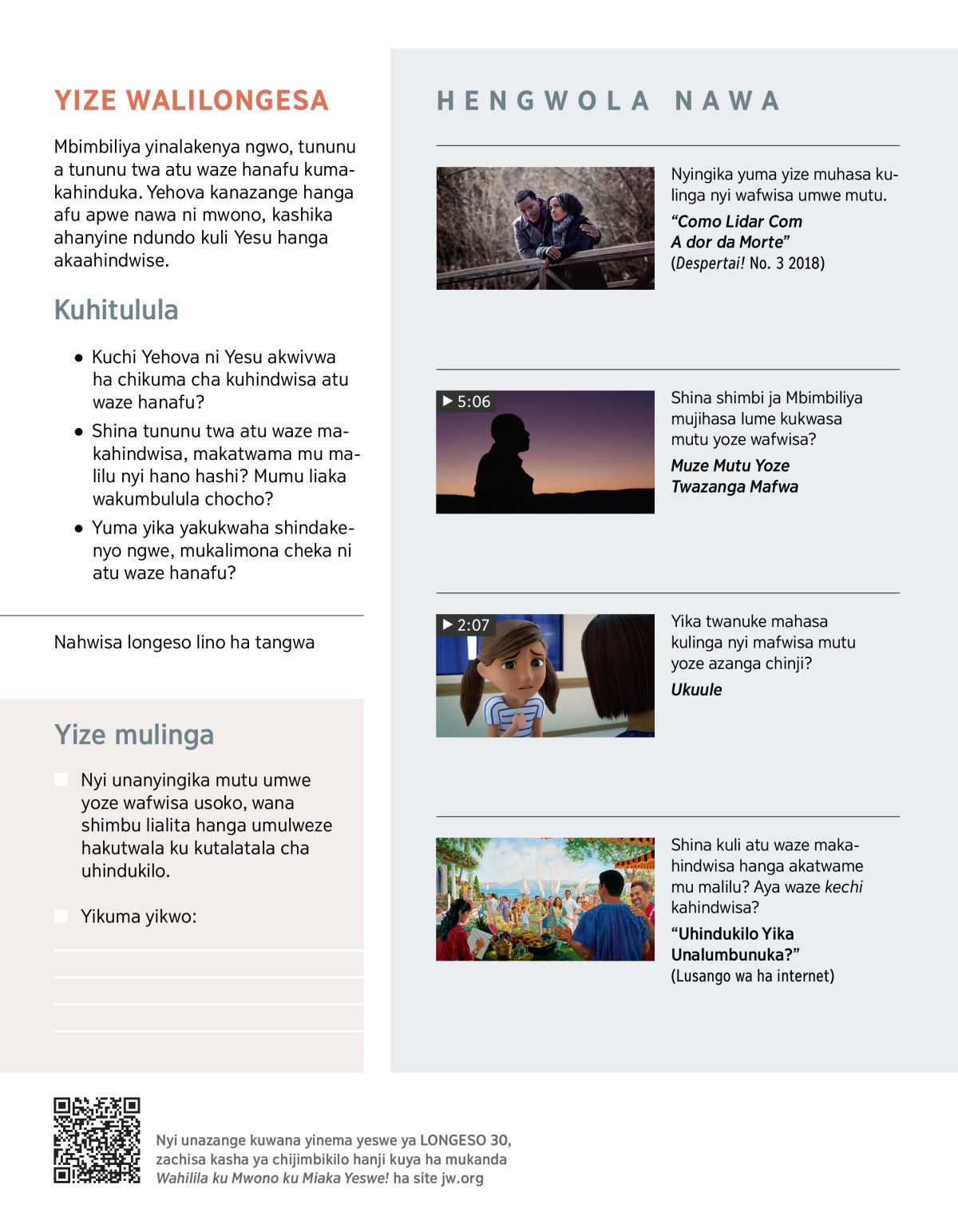 Kufwa chakuneha lamba ni yinyengo. Kashika Mbimbiliya yakuvuluka kufwa ngwo, mukwa-kole. (1 A-Korindu 15:26) Ha Longeso 27 unakalilongesaho ngwe, Yehova makahwisa kufwa. Mba yika muyikalingiwa kuli waze hanafu? Ha longeso lino mulilongesaho hakutwala ku chilakenyo chikwo chipema cha Yehova—iye makahindwisa tununu a tununu twa atu hanga akatwame ku miaka ya mutolo. Shina chino muchikalingiwa lume? Shina atu waze makahindwisa, makatwama mu malilu nyi hano hashi?