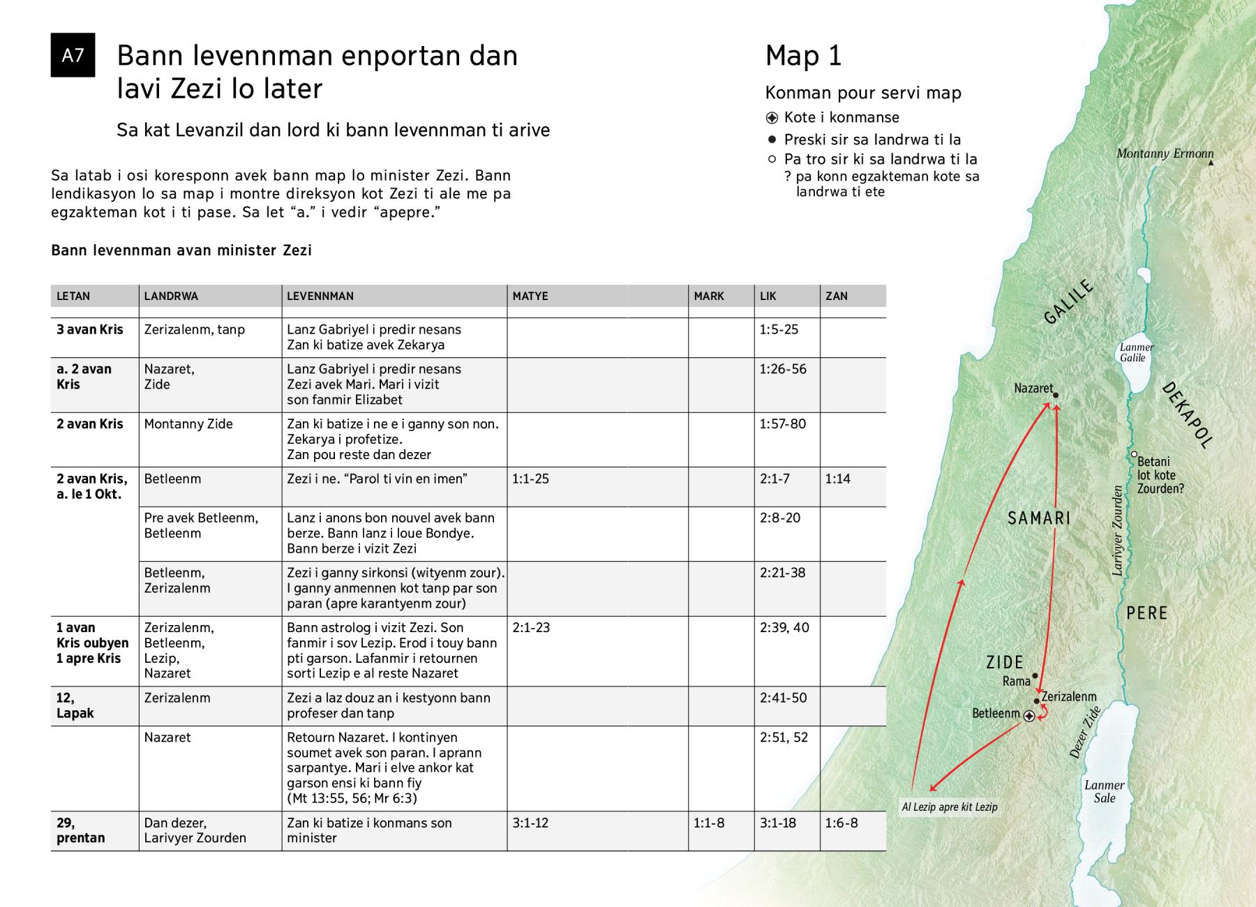 Sa latab i osi koresponn avek bann map lo minister Zezi. Bann lendikasyon lo sa map i montre direksyon kot Zezi ti ale me pa egzakteman kot i ti pase. Sa let “a.” i vedir “apepre.”
