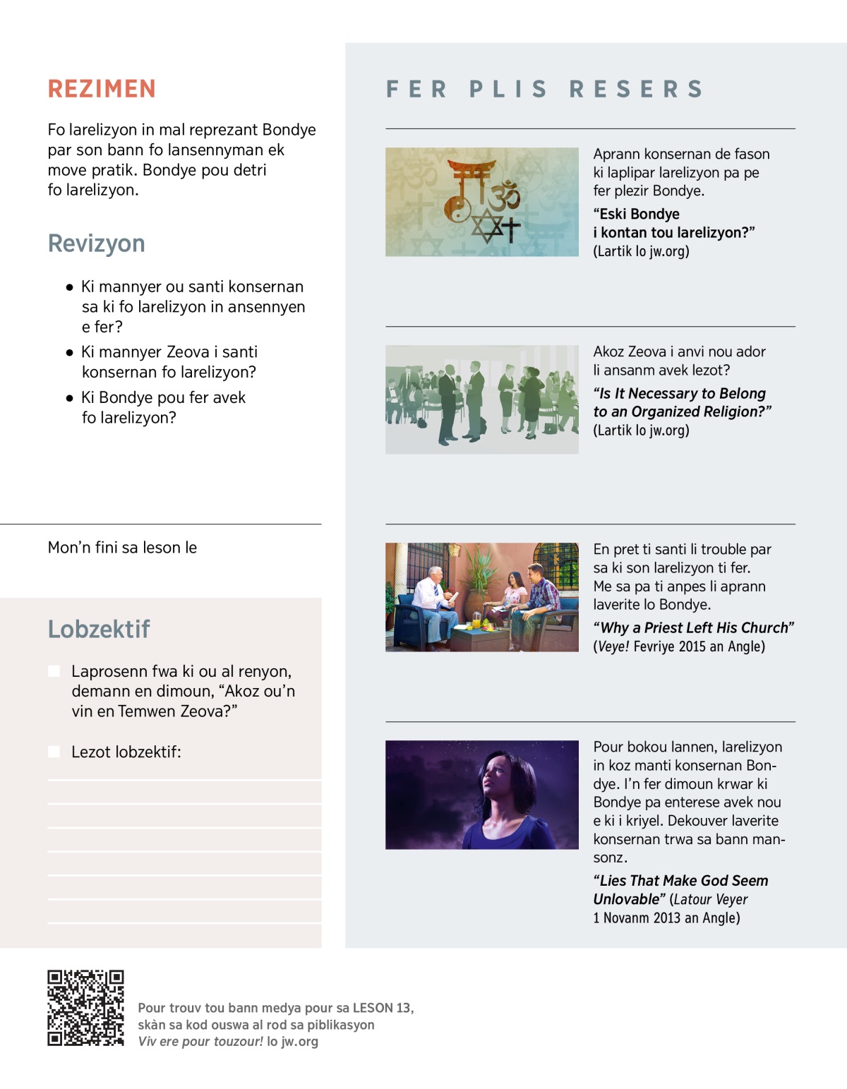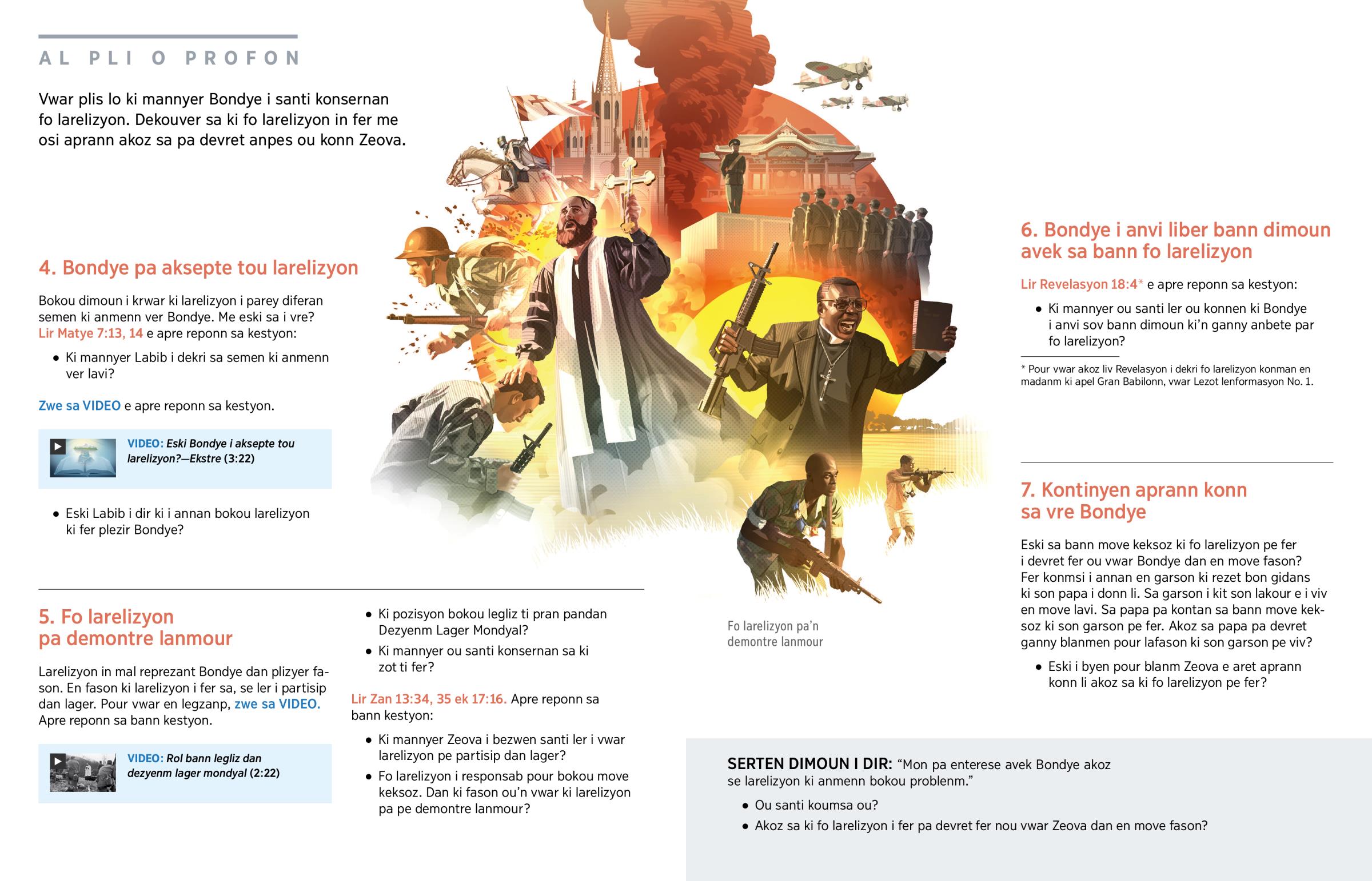 Vwar plis lo ki mannyer Bondye i santi konsernan fo larelizyon. Dekouver sa ki fo larelizyon in fer me osi aprann akoz sa pa devret anpes ou konn Zeova.