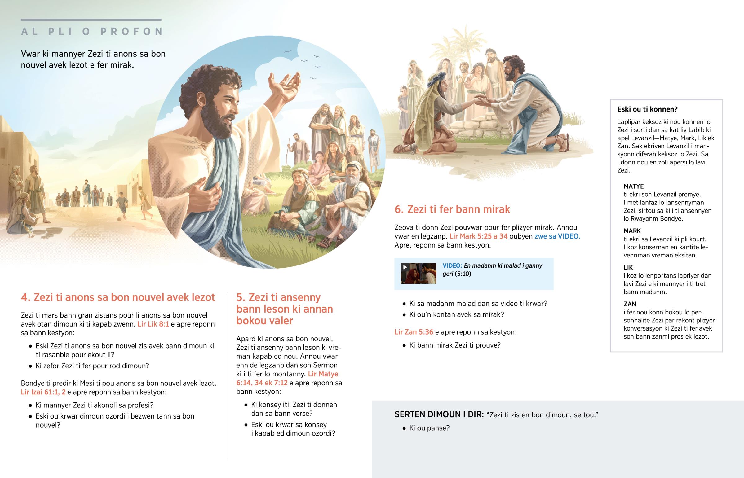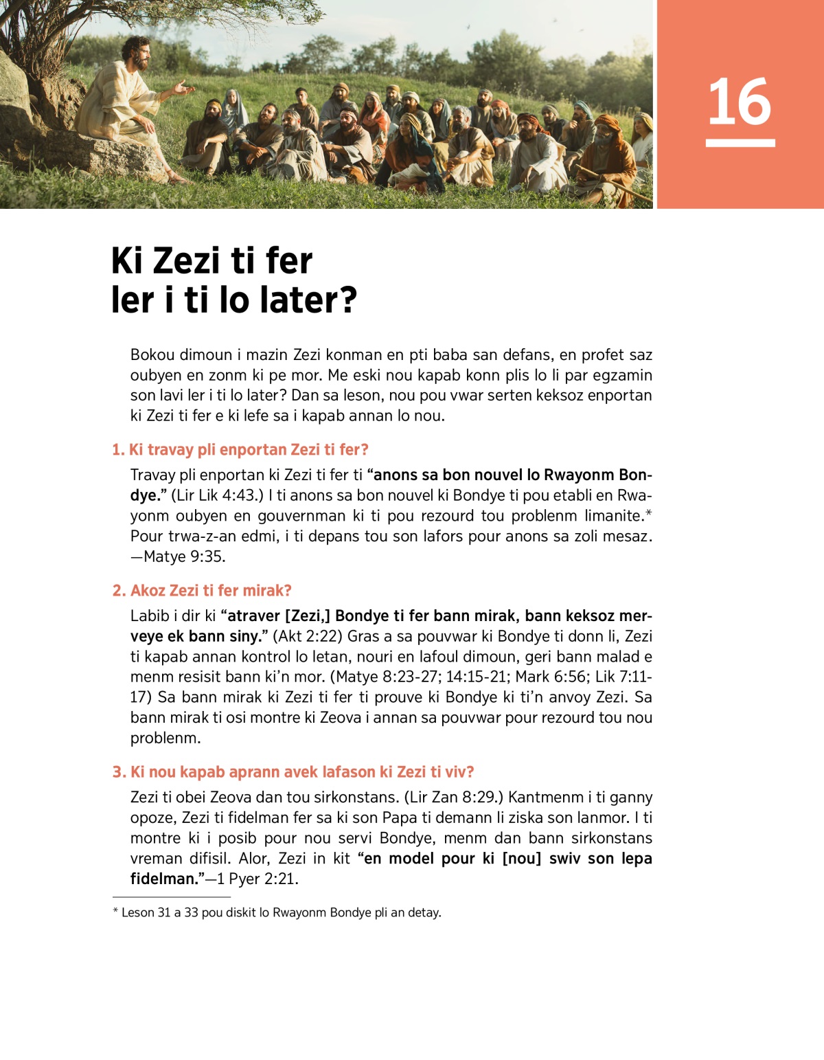 Bokou dimoun i mazin Zezi konman en pti baba san defans, en profet saz oubyen en zonm ki pe mor. Me eski nou kapab konn plis lo li par egzamin son lavi ler i ti lo later? Dan sa leson, nou pou vwar serten keksoz enportan ki Zezi ti fer e ki lefe sa i kapab annan lo nou.