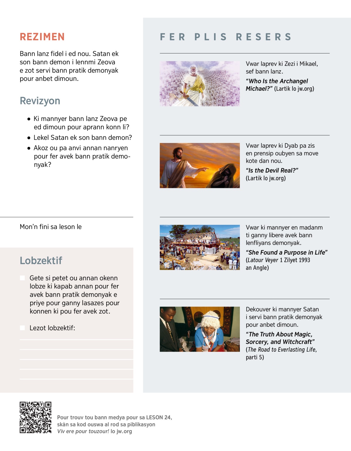 Aprann konsernan bann bon keksoz ki bann lanz i fer, danze bann pratik demonyak e ki mannyer nou kapab protez nou kont Satan ek son bann demon.
