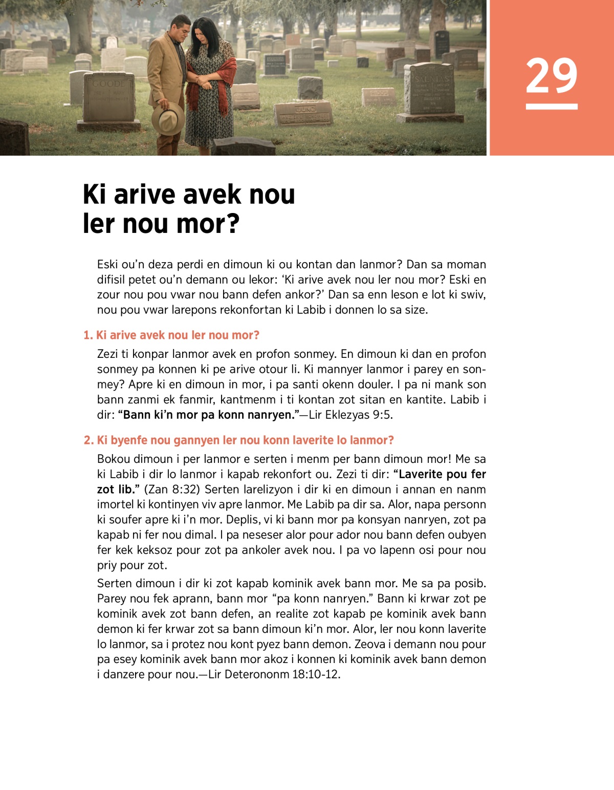 Eski ou’n deza perdi en dimoun ki ou kontan dan lanmor? Dan sa moman difisil petet ou’n demann ou lekor: ‘Ki arive avek nou ler nou mor? Eski en zour nou pou vwar nou bann defen ankor?’ Dan sa enn leson e lot ki swiv, nou pou vwar larepons rekonfortan ki Labib i donnen lo sa size.