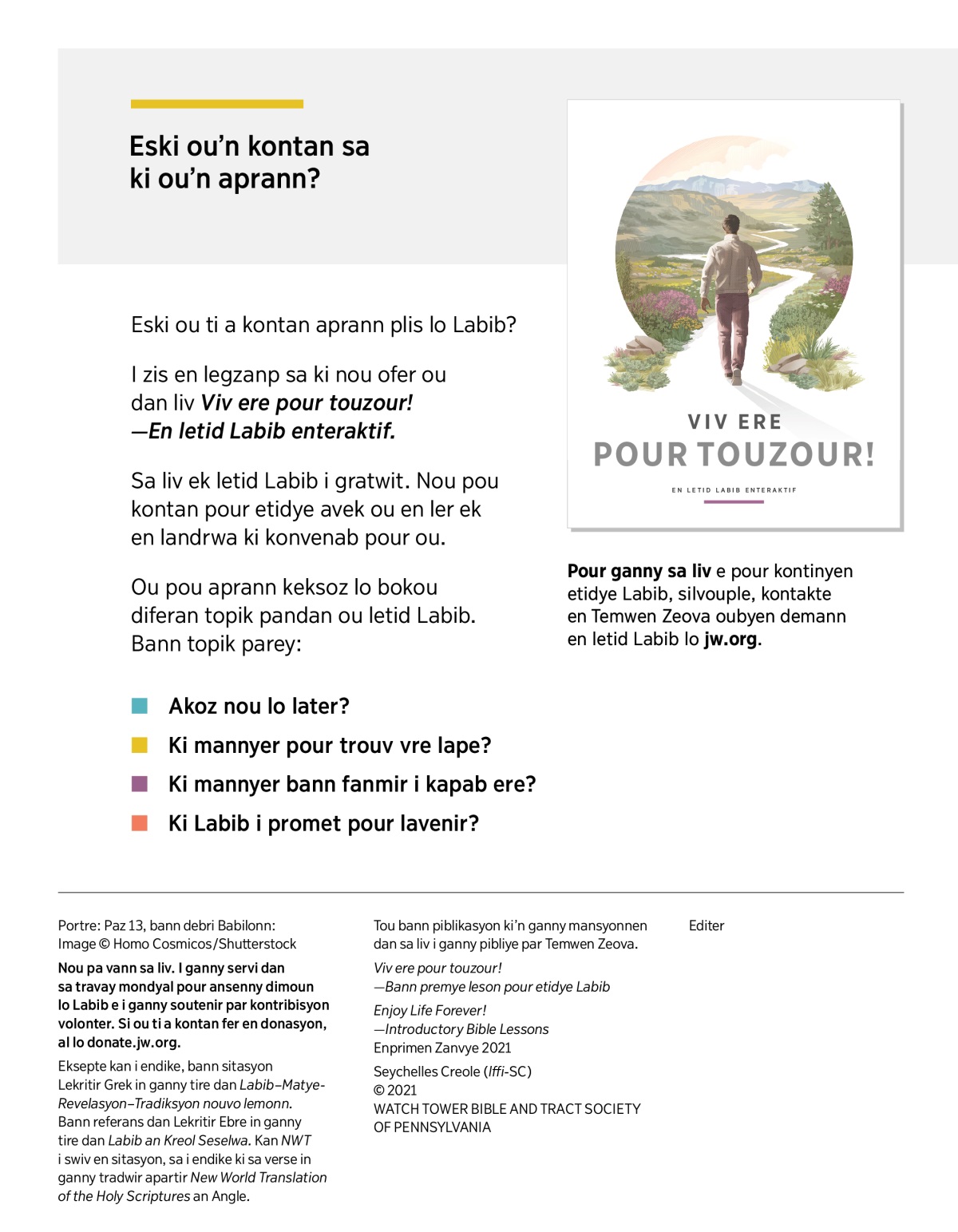 Pour ganny sa liv e pour kontinyen etidye Labib, silvouple, kontakte en Temwen Zeova oubyen demann en letid Labib lo jw.org.