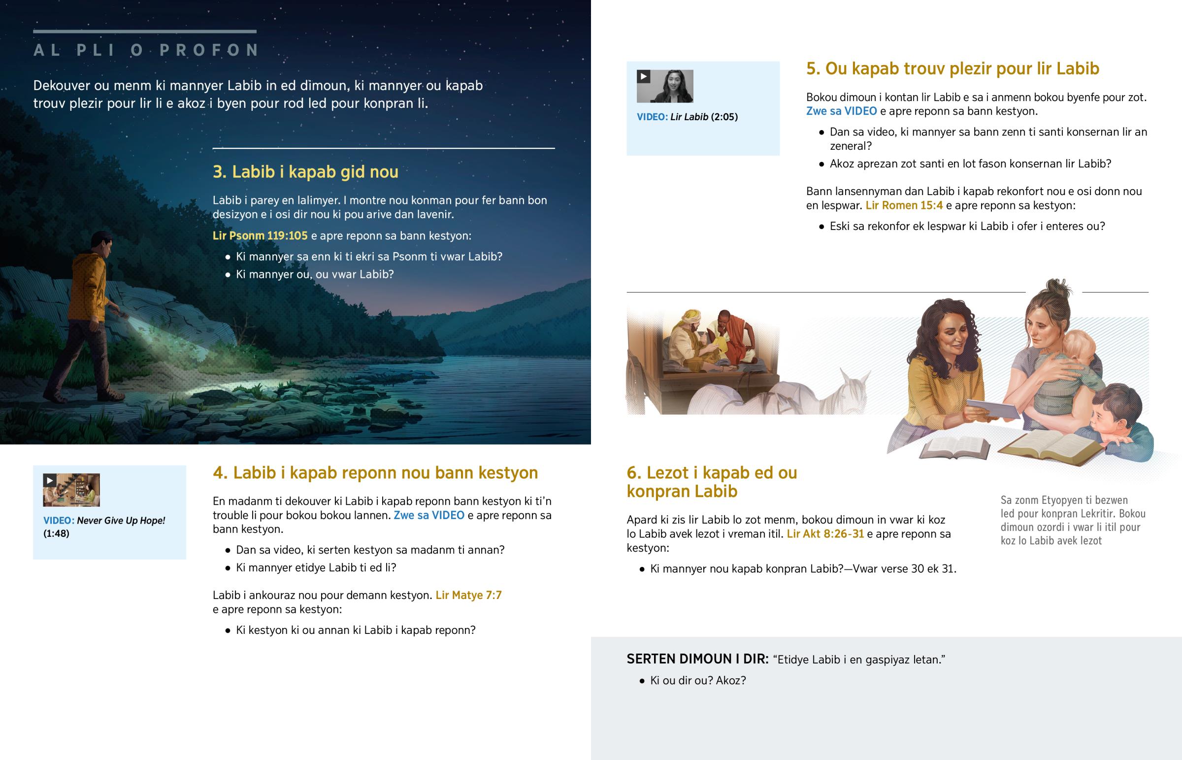 Sa piblikasyon pa ranplas Labib. Plito, i ankouraz ou pour egzamin Labib pour ou menm. Alor nou ankouraz ou pour lir bann verse Labib ki’n ganny site dan sak leson e konpar zot avek sa ki ou pe aprann.