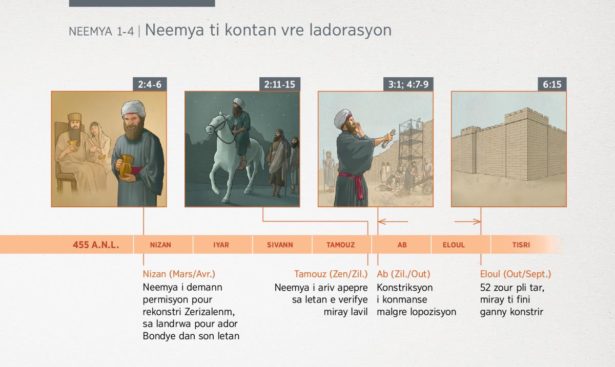2:4-6 Neemya i demann permisyon pour rekonstri Zerizalenm, sa landrwa pour ador Bondye dan son letan