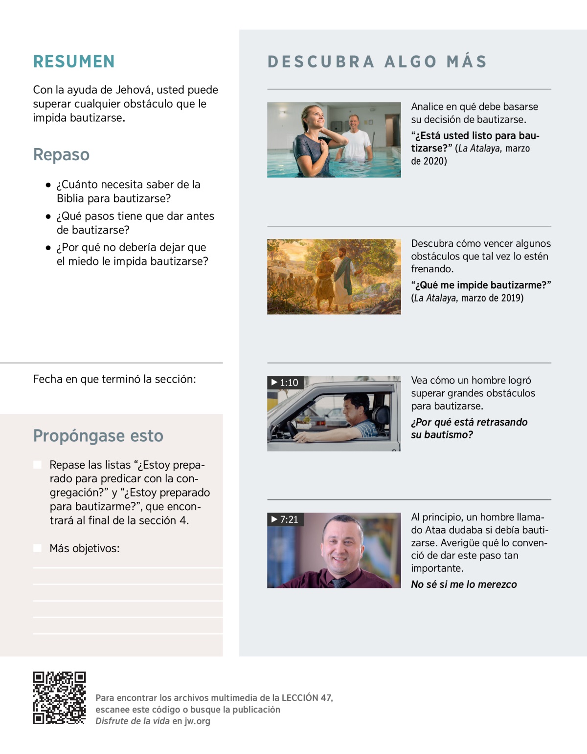 Gracias a lo que ha estudiado en la Biblia, usted ya ha aprendido mucho de Jehová. Además, es probable que haya hecho algunos cambios en su vida para poner en práctica lo que ha aprendido. Pero puede que haya algo que lo esté frenando y le impida dedicarse a Jehová y bautizarse. Esta lección analiza obstáculos que muchos estudiantes han logrado superar para bautizarse y lo que usted puede hacer para conseguirlo también.
