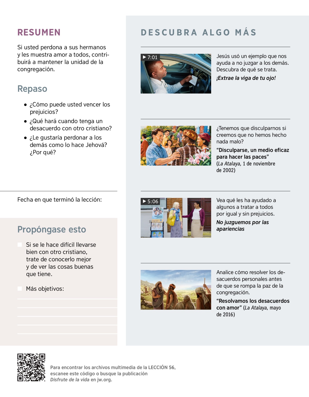 “Ámense unos a otros intensamente desde el corazón” (1 Pedro 1:22). ¿Cómo puede seguir este consejo? En vez de concentrarse en los defectos de los demás, fíjese en sus buenas cualidades. No se junte solo con los que tengan más cosas en común con usted; también intente conocer mejor a personas de otro origen y cultura. Además, trate por todos los medios de arrancar de su corazón cualquier prejuicio que pudiera tener (lea 1 Pedro 2:17).a