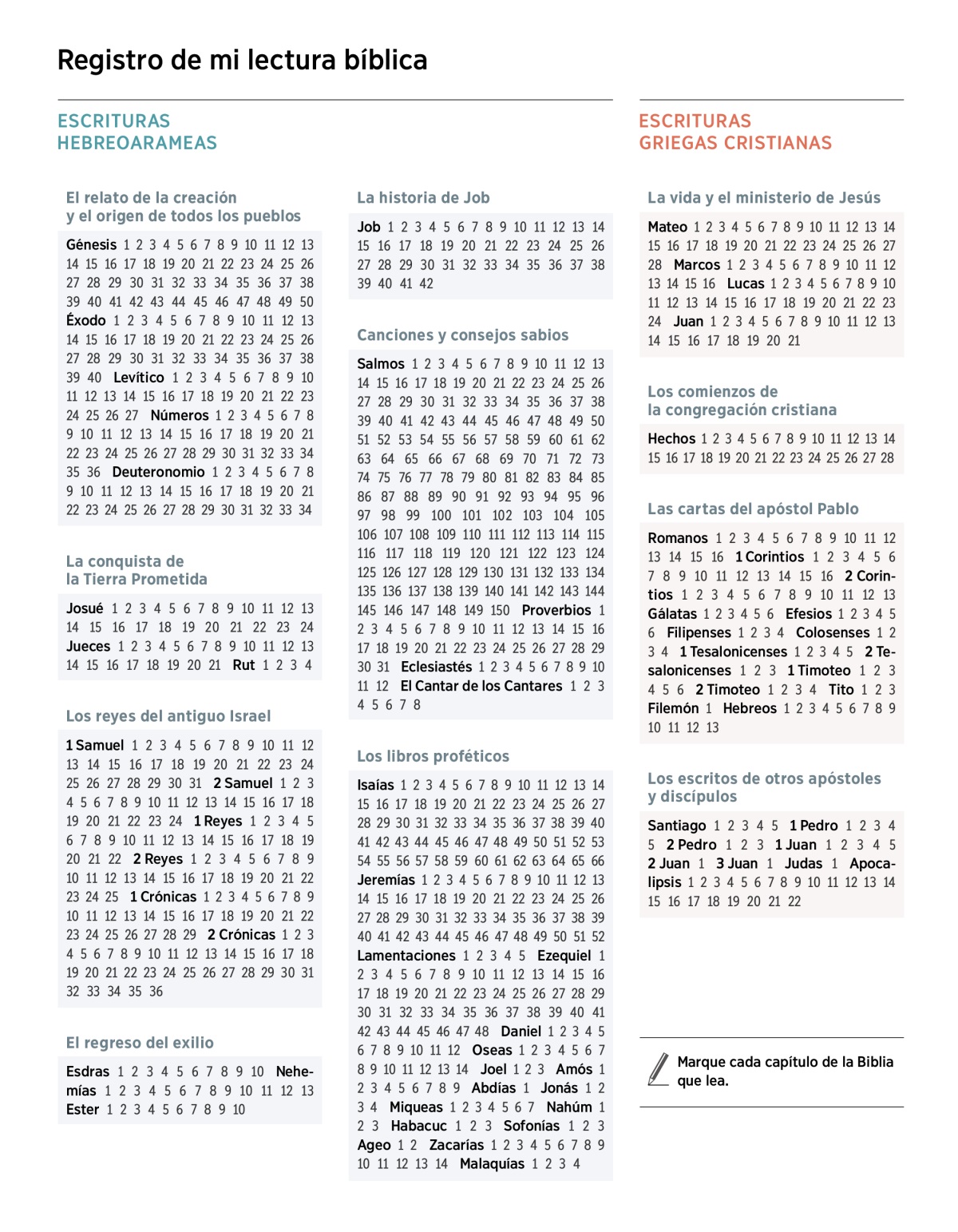Registro de mi lectura bíblica Edición impresa El relato de la creación y el origen de todos los pueblos La conquista de la Tierra Prometida Los reyes del antiguo Israel El regreso del exilio La historia de Job Canciones y consejos sabios Los libros proféticos La vida y el ministerio de Jesús Los comienzos de la congregación cristiana Las cartas del apóstol Pablo Los escritos de otros apóstoles y discípulos Marque cada capítulo de la Biblia que lea. ESCRITURAS HEBREOARAMEAS El relato de la creación y el origen de todos los pueblos Génesis 1 2 3 4 5 6 7 8 9 10 11 12 13 14 15 16 17 18 19 20 21 22 23 24 25 26 27 28 29 30 31 32 33 34 35 36 37 38 39 40 41 42 43 44 45 46 47 48 49 50 Éxodo 1 2 3 4 5 6 7 8 9 10 11 12 13 14 15 16 17 18 19 20 21 22 23 24 25 26 27 28 29 30 31 32 33 34 35 36 37 38 39 40 Levítico 1 2 3 4 5 6 7 8 9 10 11 12 13 14 15 16 17 18 19 20 21 22 23 24 25 26 27 Números 1 2 3 4 5 6 7 8 9 10 11 12 13 14 15 16 17 18 19 20 21 22 23 24 25 26 27 28 29 30 31 32 33 34 35 36 Deuteronomio 1 2 3 4 5 6 7 8 9 10 11 12 13 14 15 16 17 18 19 20 21 22 23 24 25 26 27 28 29 30 31 32 33 34 La conquista de la Tierra Prometida Josué 1 2 3 4 5 6 7 8 9 10 11 12 13 14 15 16 17 18 19 20 21 22 23 24 Jueces 1 2 3 4 5 6 7 8 9 10 11 12 13 14 15 16 17 18 19 20 21 Rut 1 2 3 4 Los reyes del antiguo Israel 1 Samuel 1 2 3 4 5 6 7 8 9 10 11 12 13 14 15 16 17 18 19 20 21 22 23 24 25 26 27 28 29 30 31 2 Samuel 1 2 3 4 5 6 7 8 9 10 11 12 13 14 15 16 17 18 19 20 21 22 23 24 1 Reyes 1 2 3 4 5 6 7 8 9 10 11 12 13 14 15 16 17 18 19 20 21 22 2 Reyes 1 2 3 4 5 6 7 8 9 10 11 12 13 14 15 16 17 18 19 20 21 22 23 24 25 1 Crónicas 1 2 3 4 5 6 7 8 9 10 11 12 13 14 15 16 17 18 19 20 21 22 23 24 25 26 27 28 29 2 Crónicas 1 2 3 4 5 6 7 8 9 10 11 12 13 14 15 16 17 18 19 20 21 22 23 24 25 26 27 28 29 30 31 32 33 34 35 36 El regreso del exilio Esdras 1 2 3 4 5 6 7 8 9 10 Nehemías 1 2 3 4 5 6 7 8 9 10 11 12 13 Ester 1 2 3 4 5 6 7 8 9 10 La historia de Job Job 1 2 3 4 5 6 7 8 9 10 11 12 13 14 15 16 17 18 19 20 21 22 23 24 25 26 27 28 29 30 31 32 33 34 35 36 37 38 39 40 41 42 Canciones y consejos sabios Salmos 1 2 3 4 5 6 7 8 9 10 11 12 13 14 15 16 17 18 19 20 21 22 23 24 25 26 27 28 29 30 31 32 33 34 35 36 37 38 39 40 41 42 43 44 45 46 47 48 49 50 51 52 53 54 55 56 57 58 59 60 61 62 63 64 65 66 67 68 69 70 71 72 73 74 75 76 77 78 79 80 81 82 83 84 85 86 87 88 89 90 91 92 93 94 95 96 97 98 99 100 101 102 103 104 105 106 107 108 109 110 111 112 113 114 115 116 117 118 119 120 121 122 123 124 125 126 127 128 129 130 131 132 133 134 135 136 137 138 139 140 141 142 143 144 145 146 147 148 149 150 Proverbios 1 2 3 4 5 6 7 8 9 10 11 12 13 14 15 16 17 18 19 20 21 22 23 24 25 26 27 28 29 30 31 Eclesiastés 1 2 3 4 5 6 7 8 9 10 11 12 El Cantar de los Cantares 1 2 3 4 5 6 7 8 Los libros proféticos Isaías 1 2 3 4 5 6 7 8 9 10 11 12 13 14 15 16 17 18 19 20 21 22 23 24 25 26 27 28 29 30 31 32 33 34 35 36 37 38 39 40 41 42 43 44 45 46 47 48 49 50 51 52 53 54 55 56 57 58 59 60 61 62 63 64 65 66 Jeremías 1 2 3 4 5 6 7 8 9 10 11 12 13 14 15 16 17 18 19 20 21 22 23 24 25 26 27 28 29 30 31 32 33 34 35 36 37 38 39 40 41 42 43 44 45 46 47 48 49 50 51 52 Lamentaciones 1 2 3 4 5 Ezequiel 1 2 3 4 5 6 7 8 9 10 11 12 13 14 15 16 17 18 19 20 21 22 23 24 25 26 27 28 29 30 31 32 33 34 35 36 37 38 39 40 41 42 43 44 45 46 47 48 Daniel 1 2 3 4 5 6 7 8 9 10 11 12 Oseas 1 2 3 4 5 6 7 8 9 10 11 12 13 14 Joel 1 2 3 Amós 1 2 3 4 5 6 7 8 9 Abdías 1 Jonás 1 2 3 4 Miqueas 1 2 3 4 5 6 7 Nahúm 1 2 3 Habacuc 1 2 3 Sofonías 1 2 3 Ageo 1 2 Zacarías 1 2 3 4 5 6 7 8 9 10 11 12 13 14 Malaquías 1 2 3 4 ESCRITURAS GRIEGAS CRISTIANAS La vida y el ministerio de Jesús Mateo 1 2 3 4 5 6 7 8 9 10 11 12 13 14 15 16 17 18 19 20 21 22 23 24 25 26 27 28 Marcos 1 2 3 4 5 6 7 8 9 10 11 12 13 14 15 16 Lucas 1 2 3 4 5 6 7 8 9 10 11 12 13 14 15 16 17 18 19 20 21 22 23 24 Juan 1 2 3 4 5 6 7 8 9 10 11 12 13 14 15 16 17 18 19 20 21 Los comienzos de la congregación cristiana Hechos 1 2 3 4 5 6 7 8 9 10 11 12 13 14 15 16 17 18 19 20 21 22 23 24 25 26 27 28 Las cartas del apóstol Pablo Romanos 1 2 3 4 5 6 7 8 9 10 11 12 13 14 15 16 1 Corintios 1 2 3 4 5 6 7 8 9 10 11 12 13 14 15 16 2 Corintios 1 2 3 4 5 6 7 8 9 10 11 12 13 Gálatas 1 2 3 4 5 6 Efesios 1 2 3 4 5 6 Filipenses 1 2 3 4 Colosenses 1 2 3 4 1 Tesalonicenses 1 2 3 4 5 2 Tesalonicenses 1 2 3 1 Timoteo 1 2 3 4 5 6 2 Timoteo 1 2 3 4 Tito 1 2 3 Filemón 1 Hebreos 1 2 3 4 5 6 7 8 9 10 11 12 13 Los escritos de otros apóstoles y discípulos Santiago 1 2 3 4 5 1 Pedro 1 2 3 4 5 2 Pedro 1 2 3 1 Juan 1 2 3 4 5 2 Juan 1 3 Juan 1 Judas 1 Apocalipsis 1 2 3 4 5 6 7 8 9 10 11 12 13 14 15 16 17 18 19 20 21 22