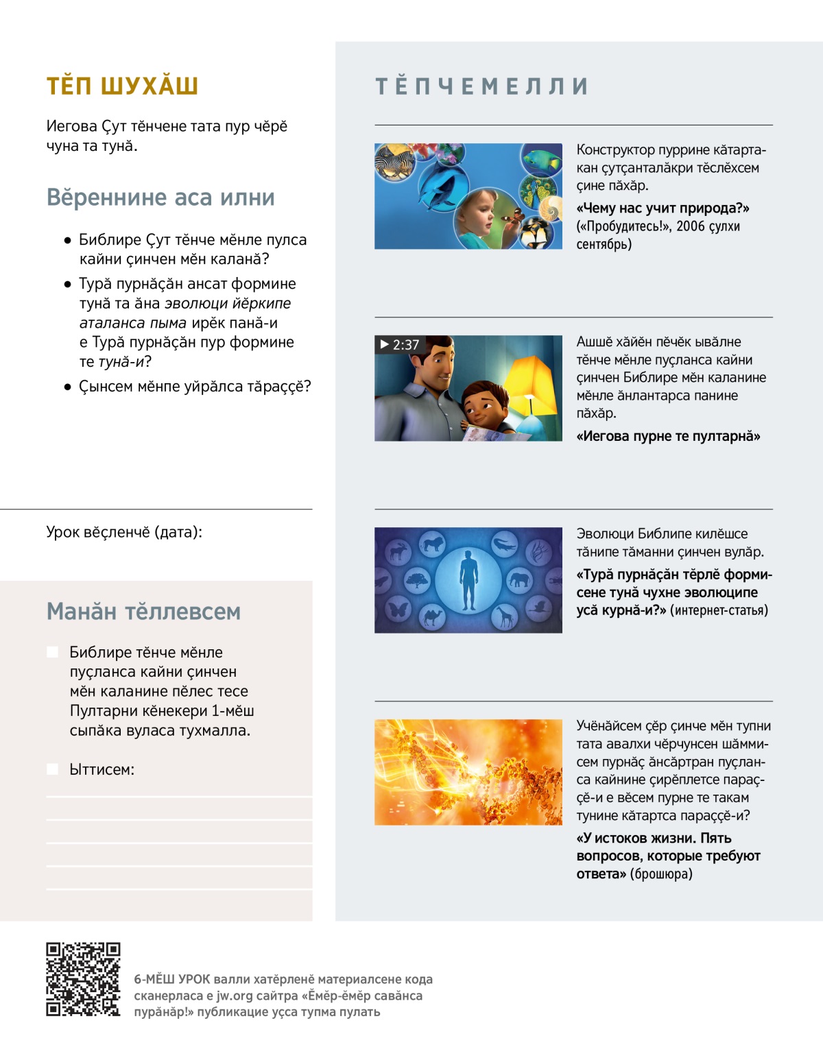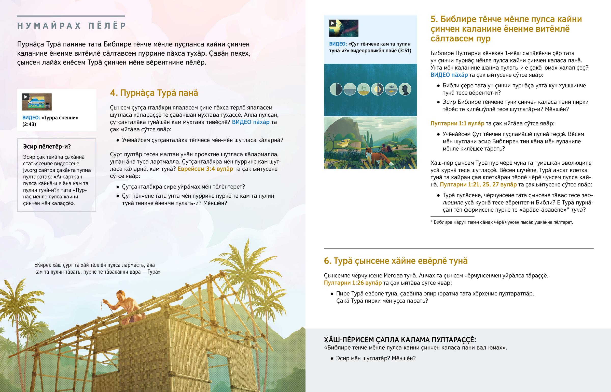 Пурнӑҫа Турӑ панине тата Библире тӗнче мӗнле пуҫланса кайни ҫинчен каланине ӗненме витӗмлӗ сӑлтавсем пуррине пӑхса тухӑр. Ҫавӑн пекех, ҫынсен лайӑх енӗсем Турӑ ҫинчен мӗне вӗрентнине пӗлӗр.