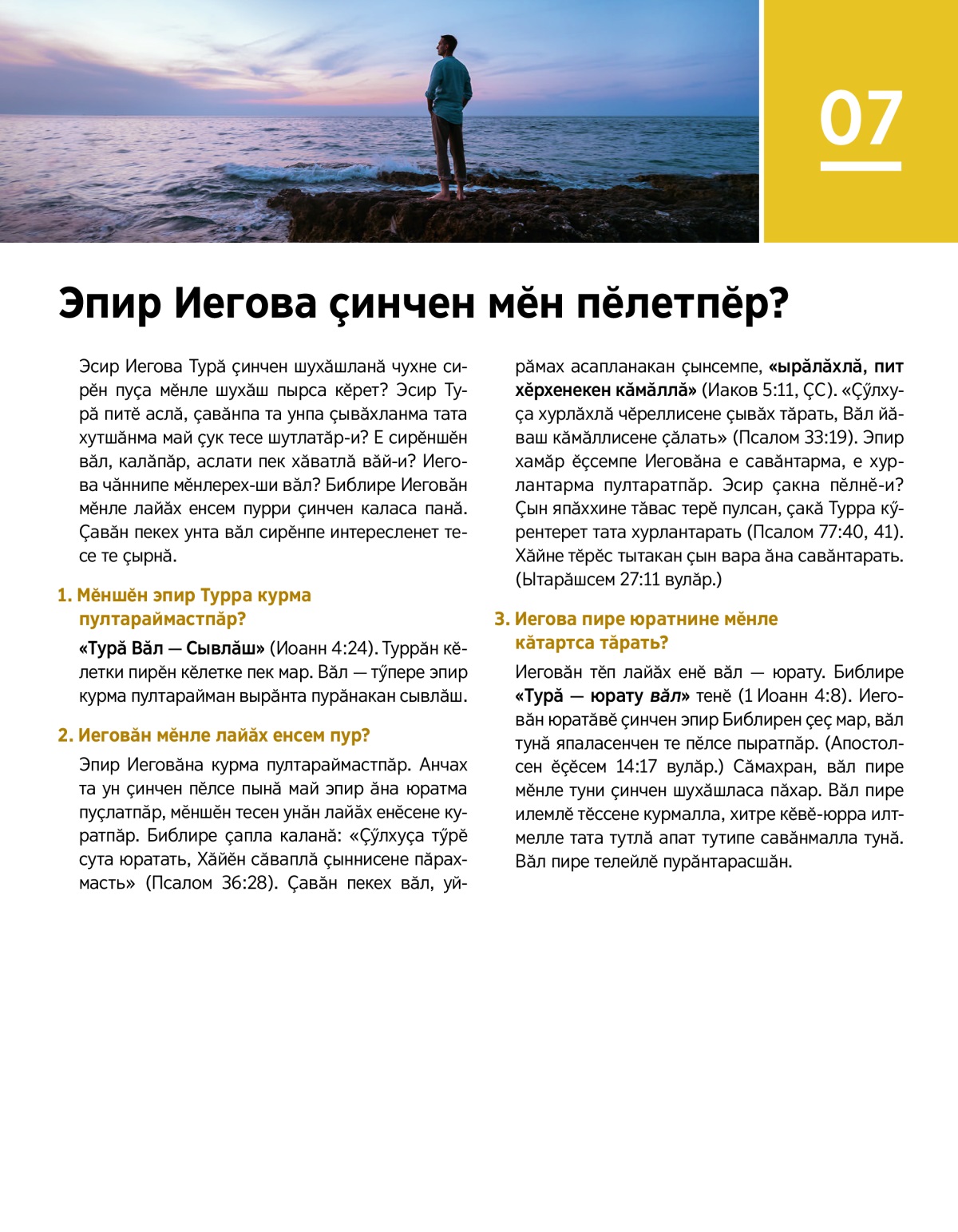 Эсир Иегова Турӑ ҫинчен шухӑшланӑ чухне сирӗн пуҫа мӗнле шухӑш пырса кӗрет? Эсир Турӑ питӗ аслӑ, ҫавӑнпа та унпа ҫывӑхланма тата хутшӑнма май ҫук тесе шутлатӑр-и? Е сирӗншӗн вӑл, калӑпӑр, аслати пек хӑватлӑ вӑй-и? Иегова чӑннипе мӗнлерех-ши вӑл? Библире Иеговӑн мӗнле лайӑх енсем пурри ҫинчен каласа панӑ. Ҫавӑн пекех унта вӑл сирӗнпе интересленет тесе те ҫырнӑ.