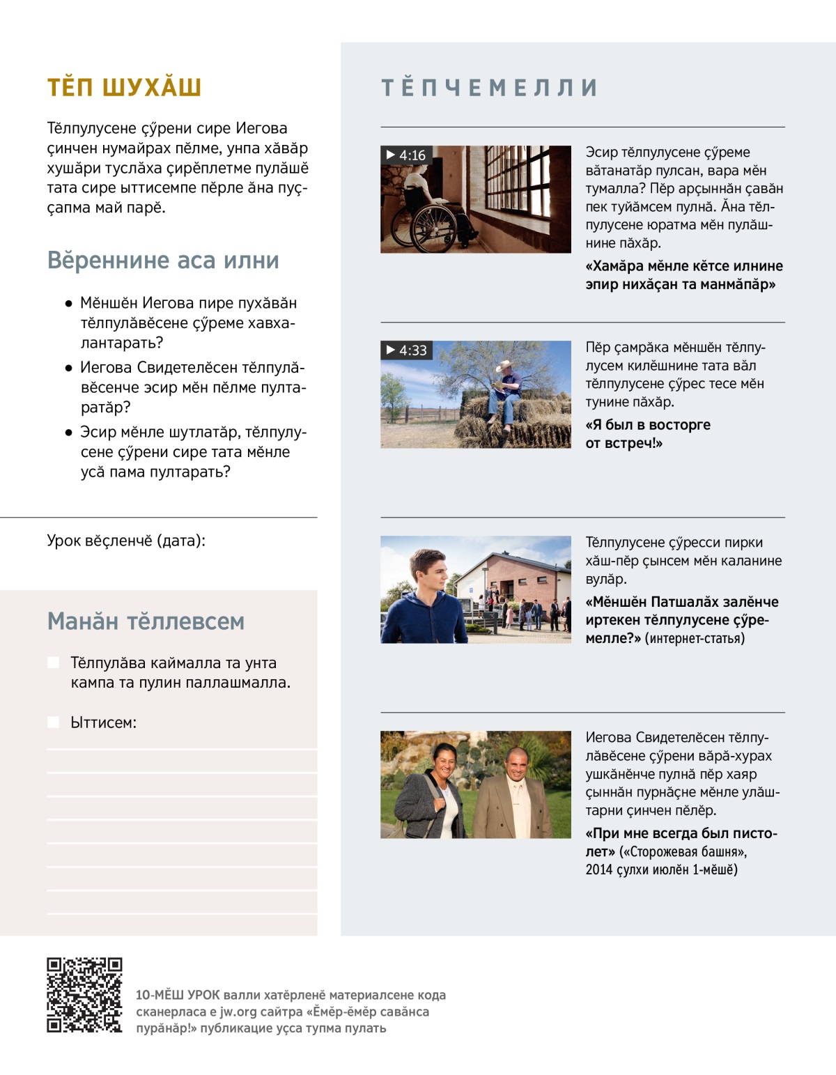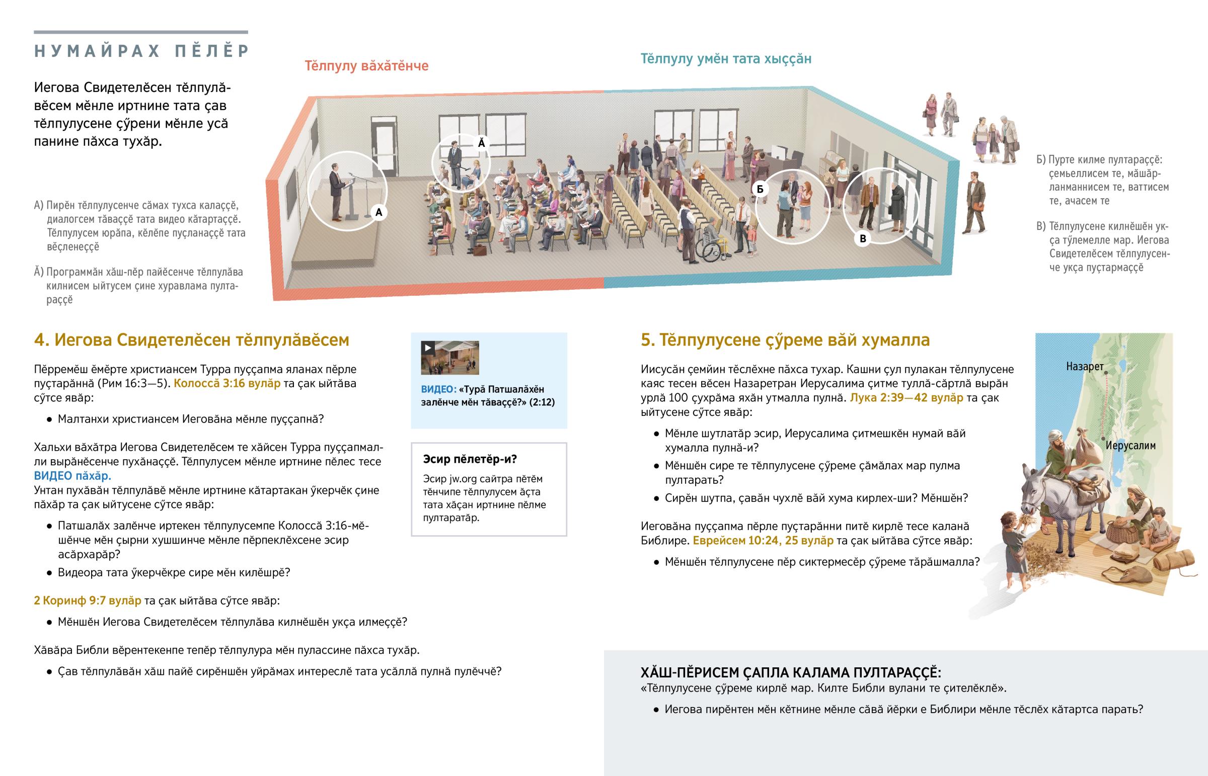 Сире Иегова Свидетелӗсен тӗлпулӑвӗсене чӗннӗ-и? Эсир унта пулман пулсан, сире унта пӗрремӗш хут кайса килесси кӑштах пӑшӑрхантарма пултарать. Тен, сирӗн ҫакӑн пек шухӑшсем пур: «Ҫав тӗлпулусем мӗнле иртеҫҫӗ? Мӗншӗн вӗсем кирлӗ? Мӗншӗн ҫав тӗлпулусене ҫӳремелле?» Ҫак урокран эсир ҫав тӗлпулусем сире Иеговӑпа ҫывӑхланма тата сире хӑвӑра мӗнле пулӑшнине пӗлме пултаратӑр.