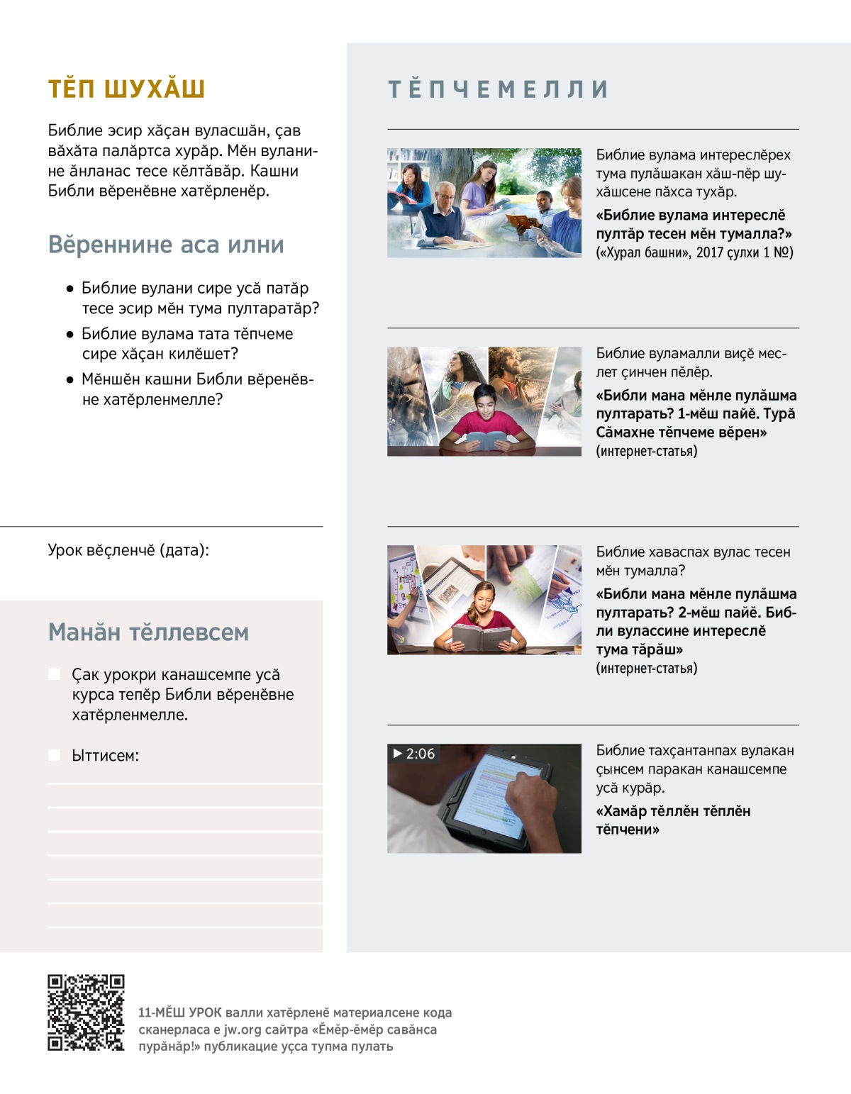 Кашни Библи вӗренӗвӗ ытларах усӑ патӑр тесе эсир мӗн тума пултаратӑр? Ҫак кӗнекери уроксене хатӗрленнӗ чухне ҫакӑн пек меслетпе усӑ курса пӑхӑр: