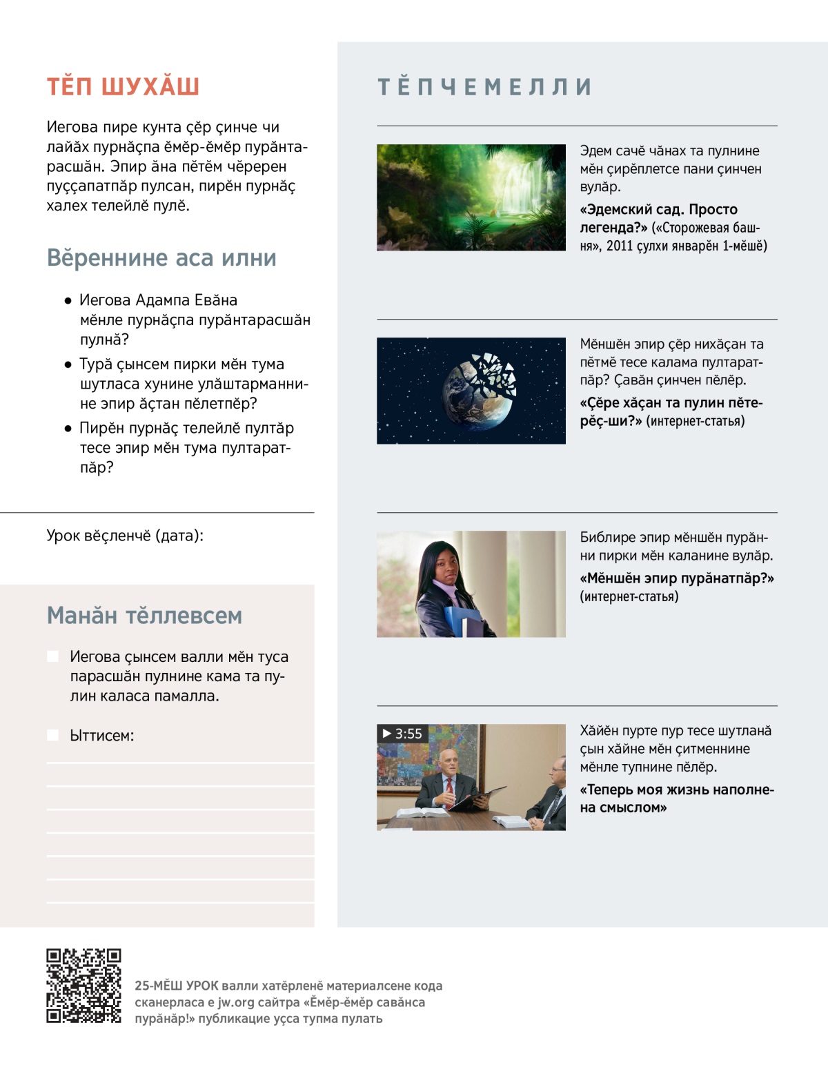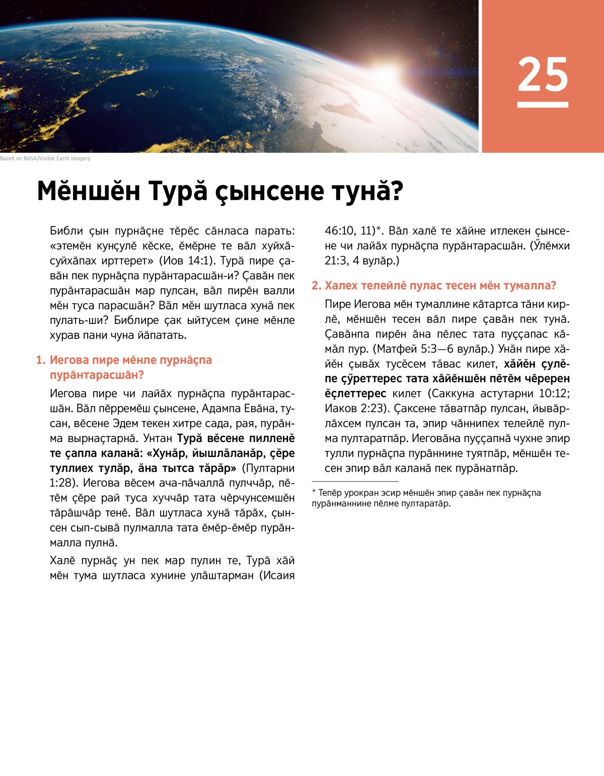 Иегова ҫӗре пирӗн валли хатӗрленӗ чухне хӑйӗн юратӑвне мӗнле кӑтартнине тата унӑн Сӑмахӗнче, Библире, эпир мӗншӗн пурӑнни ҫинчен мӗн каланине пӗлӗр.
