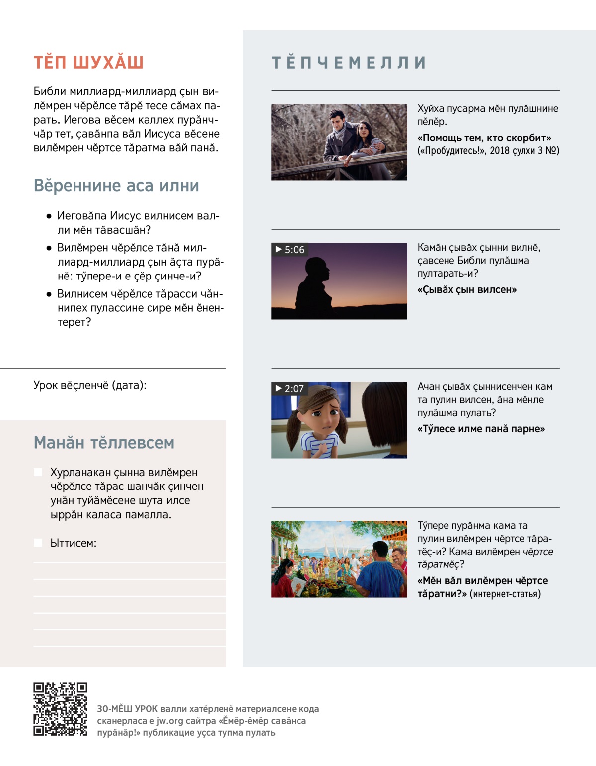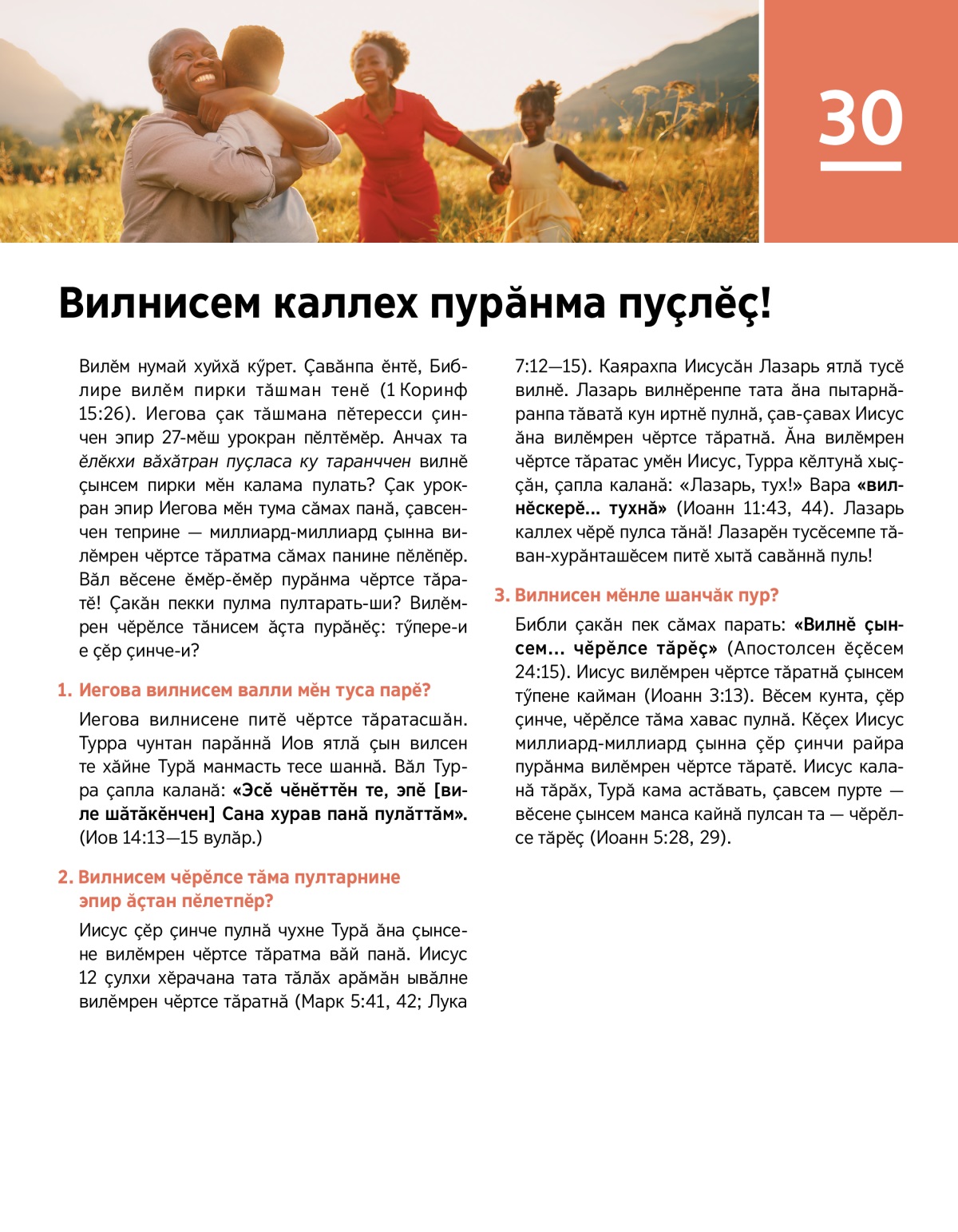Вилӗм нумай хуйхӑ кӳрет. Ҫавӑнпа ӗнтӗ, Библире вилӗм пирки тӑшман тенӗ (1 Коринф 15:26). Иегова ҫак тӑшмана пӗтересси ҫинчен эпир 27-мӗш урокран пӗлтӗмӗр. Анчах та ӗлӗкхи вӑхӑтран пуҫласа ку таранччен вилнӗ ҫынсем пирки мӗн калама пулать? Ҫак урокран эпир Иегова мӗн тума сӑмах панӑ, ҫавсенчен теприне — миллиард-миллиард ҫынна вилӗмрен чӗртсе тӑратма сӑмах панине пӗлӗпӗр. Вӑл вӗсене ӗмӗр-ӗмӗр пурӑнма чӗртсе тӑратӗ! Ҫакӑн пекки пулма пултарать-ши? Вилӗмрен чӗрӗлсе тӑнисем ӑҫта пурӑнӗҫ: тӳпере-и е ҫӗр ҫинче-и?