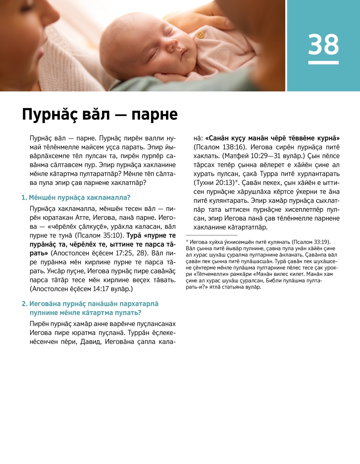 Иегова пире хӑй панӑ парнене — пурнӑҫа — юратма, хисеплеме тата сыхлама вӗрентет. Пирӗн хамӑр пурнӑҫ ҫине те, ыттисен пурнӑҫӗ ҫине те ҫавӑн пек пӑхмалла.