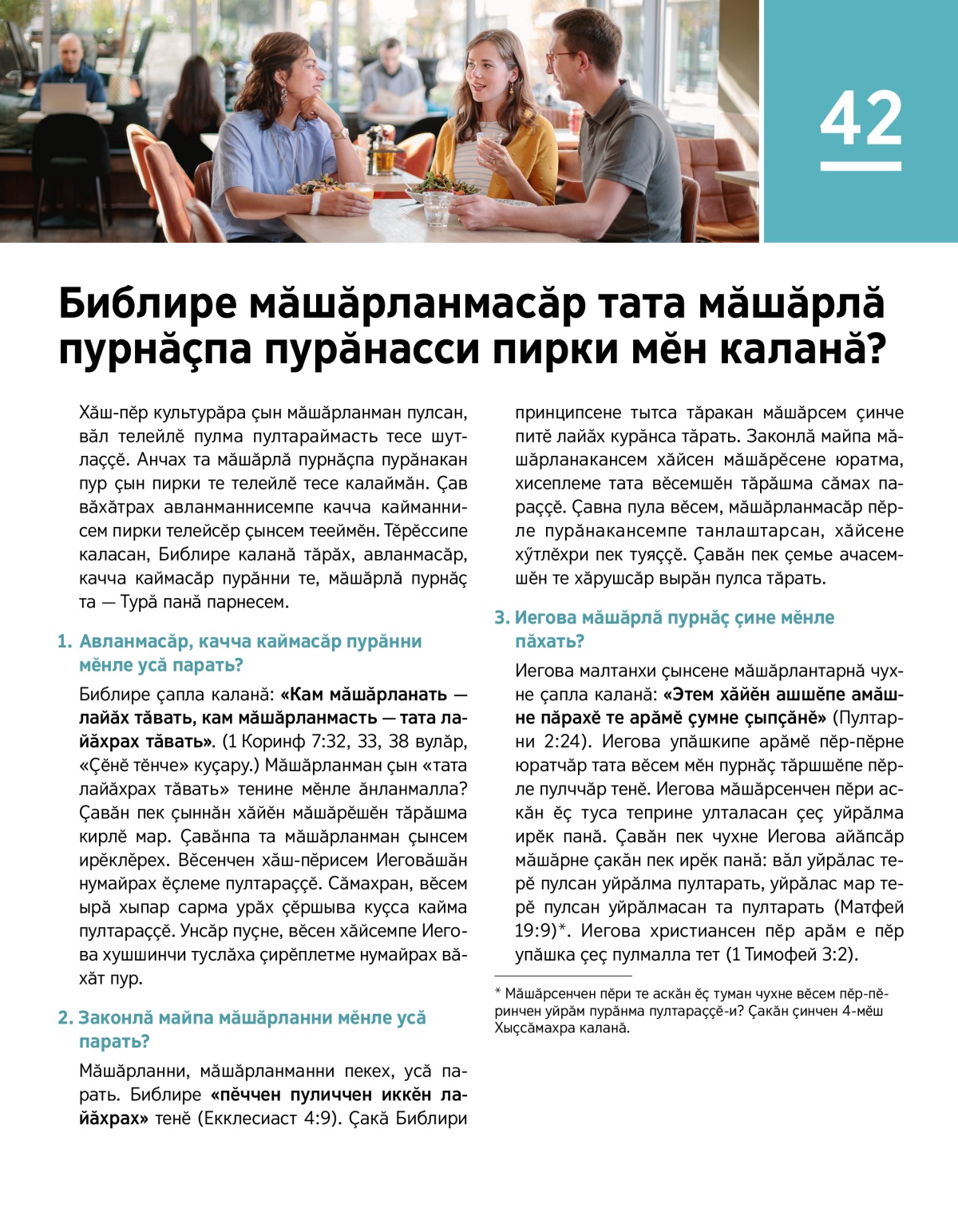 Иисус мӑшӑрланмасӑр пурӑннине Турӑ панӑ пултарулӑх тенӗ (Матфей 19:11, 12). Матфей 4:23 вулӑр та ҫак ыйтӑва сӳтсе явӑр:
