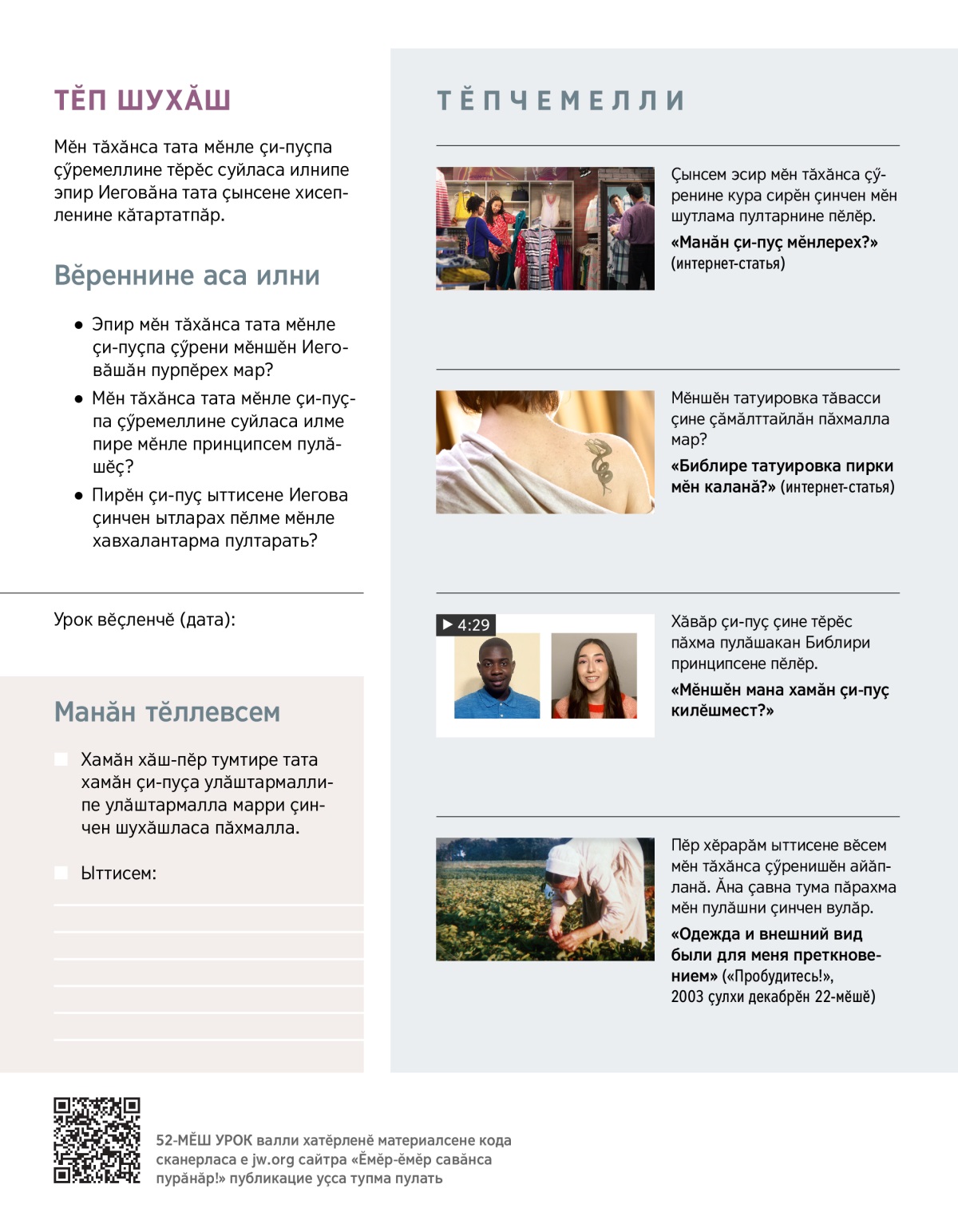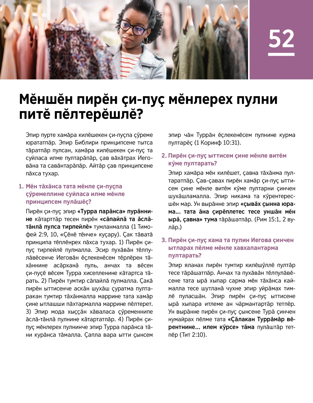 Эпир пурте хамӑра килӗшекен ҫи-пуҫпа ҫӳреме юрататпӑр. Эпир Библири принципсене тытса тӑратпӑр пулсан, хамӑра килӗшекен ҫи-пуҫ та суйласа илме пултарӑпӑр, ҫав вӑхӑтрах Иеговӑна та савӑнтарӑпӑр. Айтӑр ҫав принципсене пӑхса тухар.